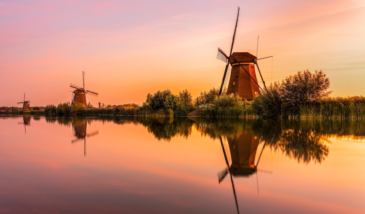 Kinderdijk, Windmills, Netherlands, Sunset 4K Desktop Wallpaper