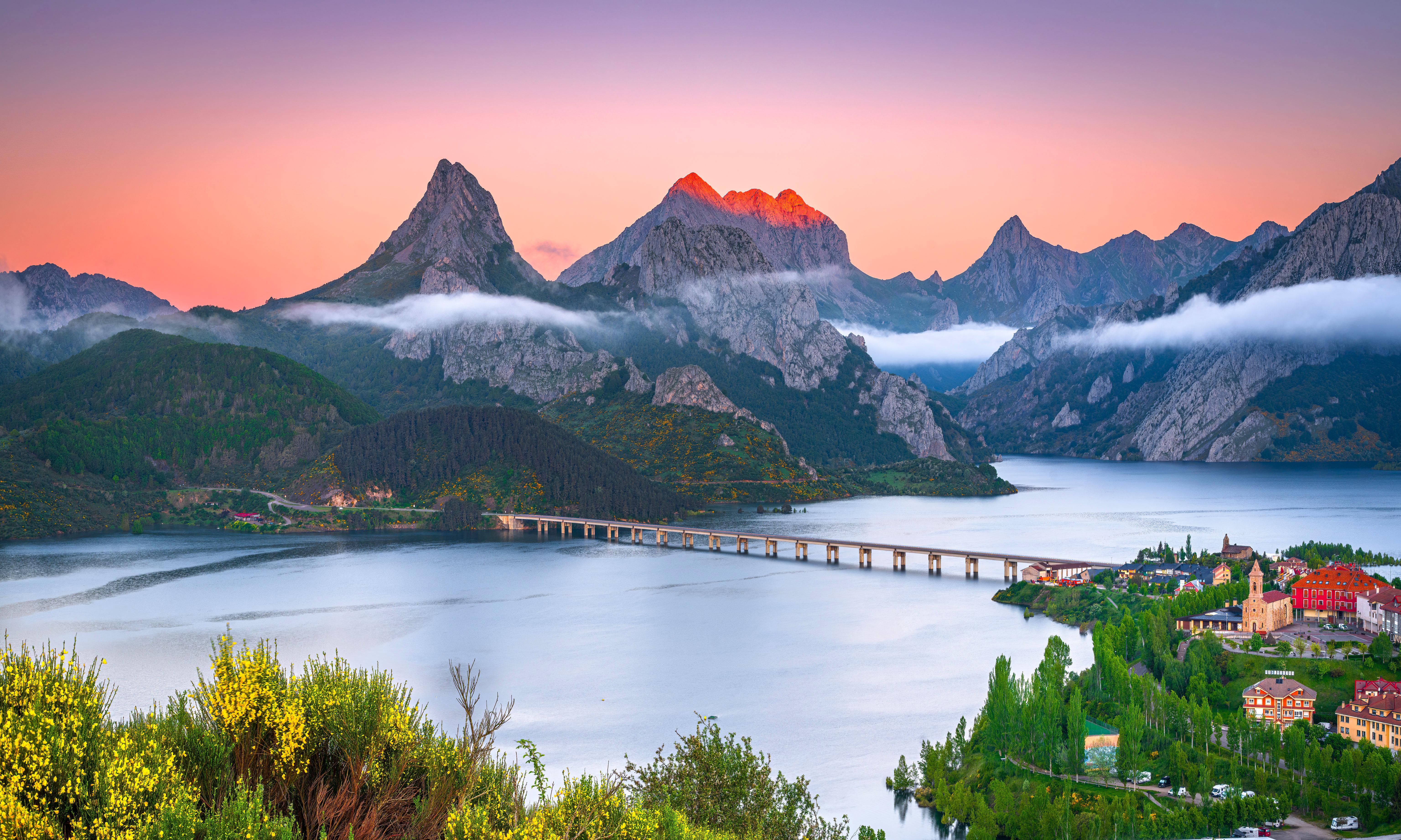 Lake, Mountains, Bridge, Sunrise 5K Desktop Wallpaper