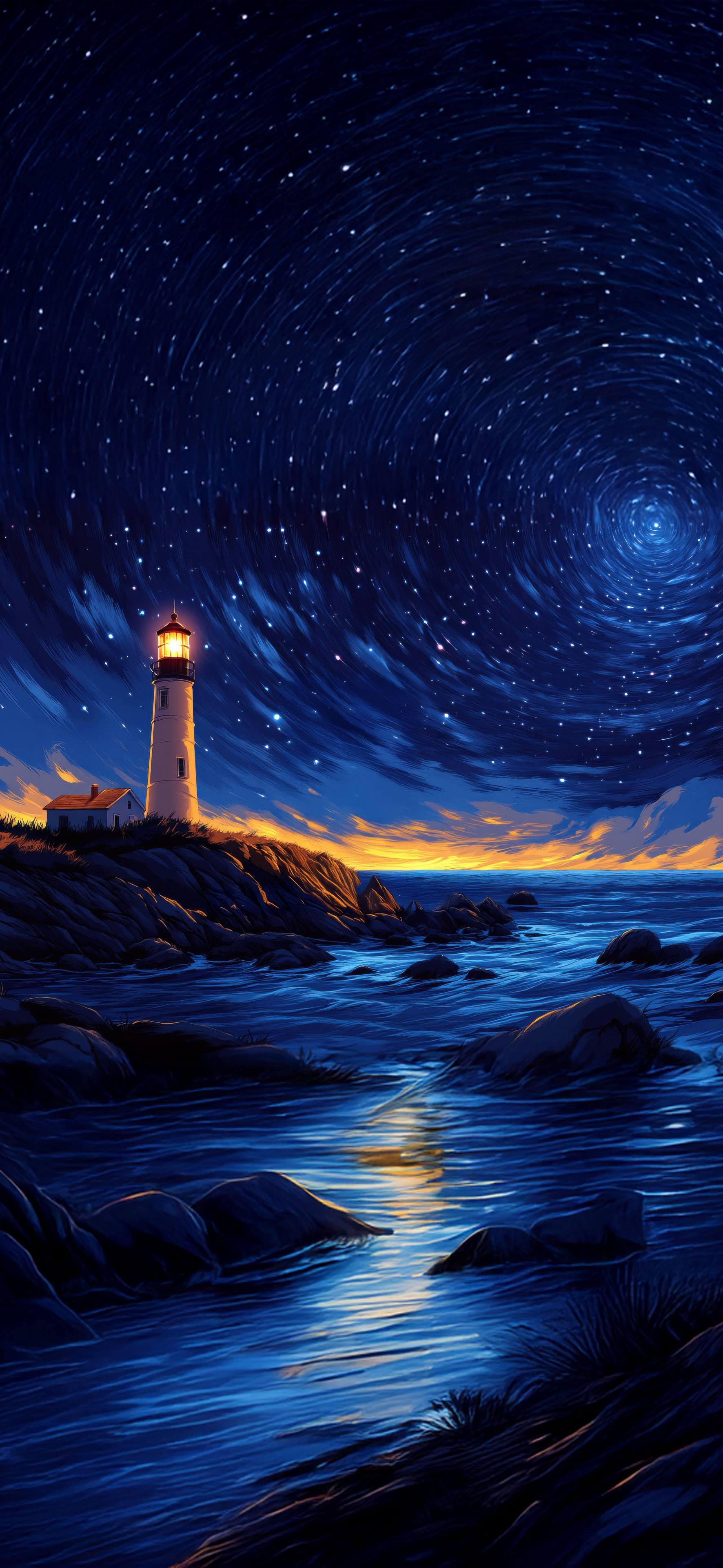 Lighthouse, Starry Night, Ocean, Coastal Landscape 2K iPhone Phone Wallpaper