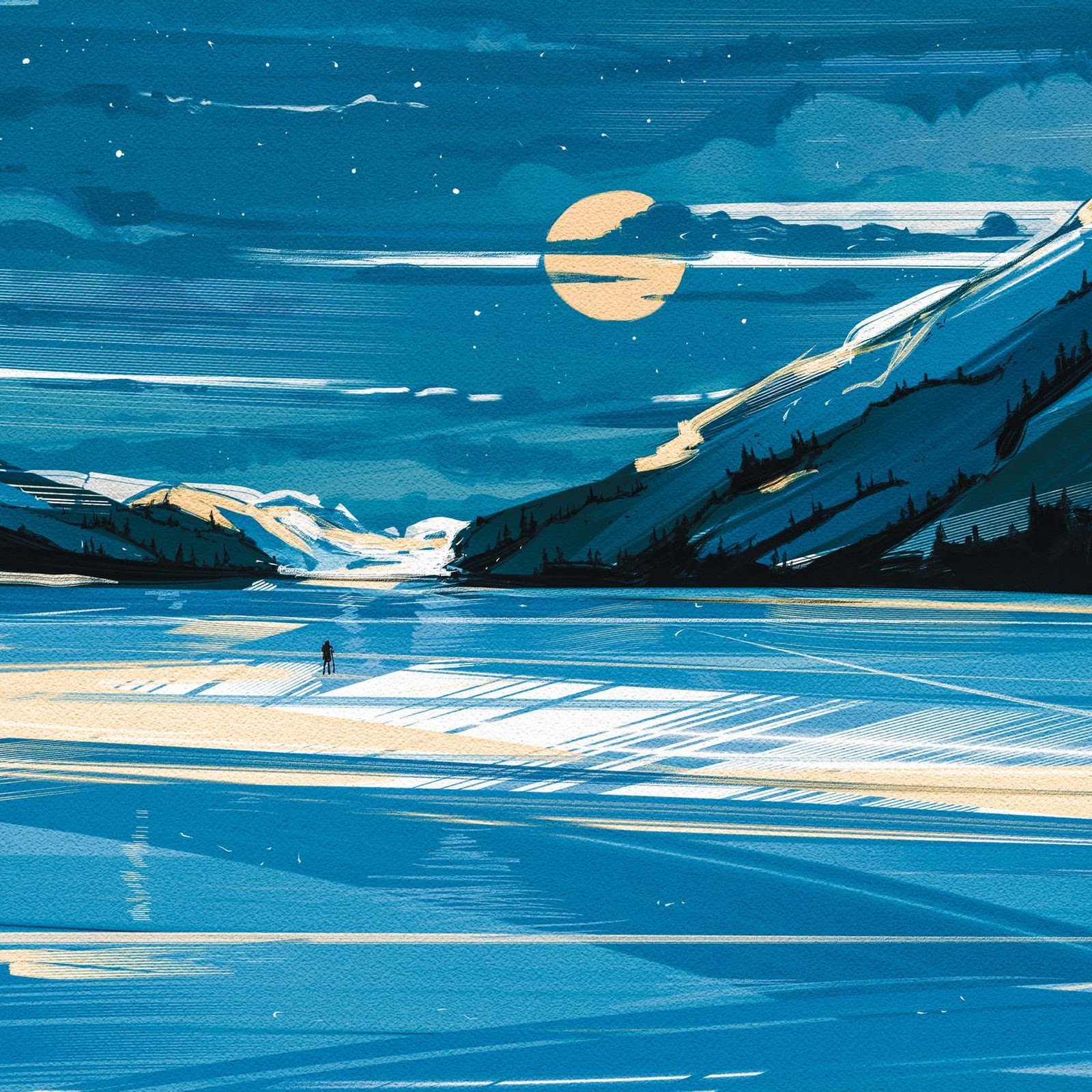 Mountainscape, Lake, Moonlight, Illustration Full HD Desktop and Mobile Wallpaper Background with a maximum resolution of 2500x1458 px.