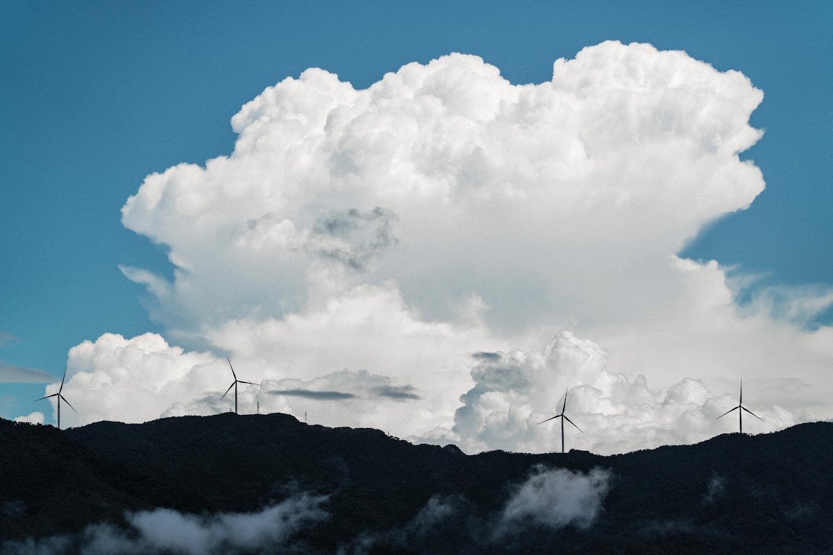 Wind Turbines, Renewable Energy, Mountain Landscape, Cumulus Clouds 4K Desktop and Mobile Wallpaper Background with a maximum resolution of 3976x2652 px.