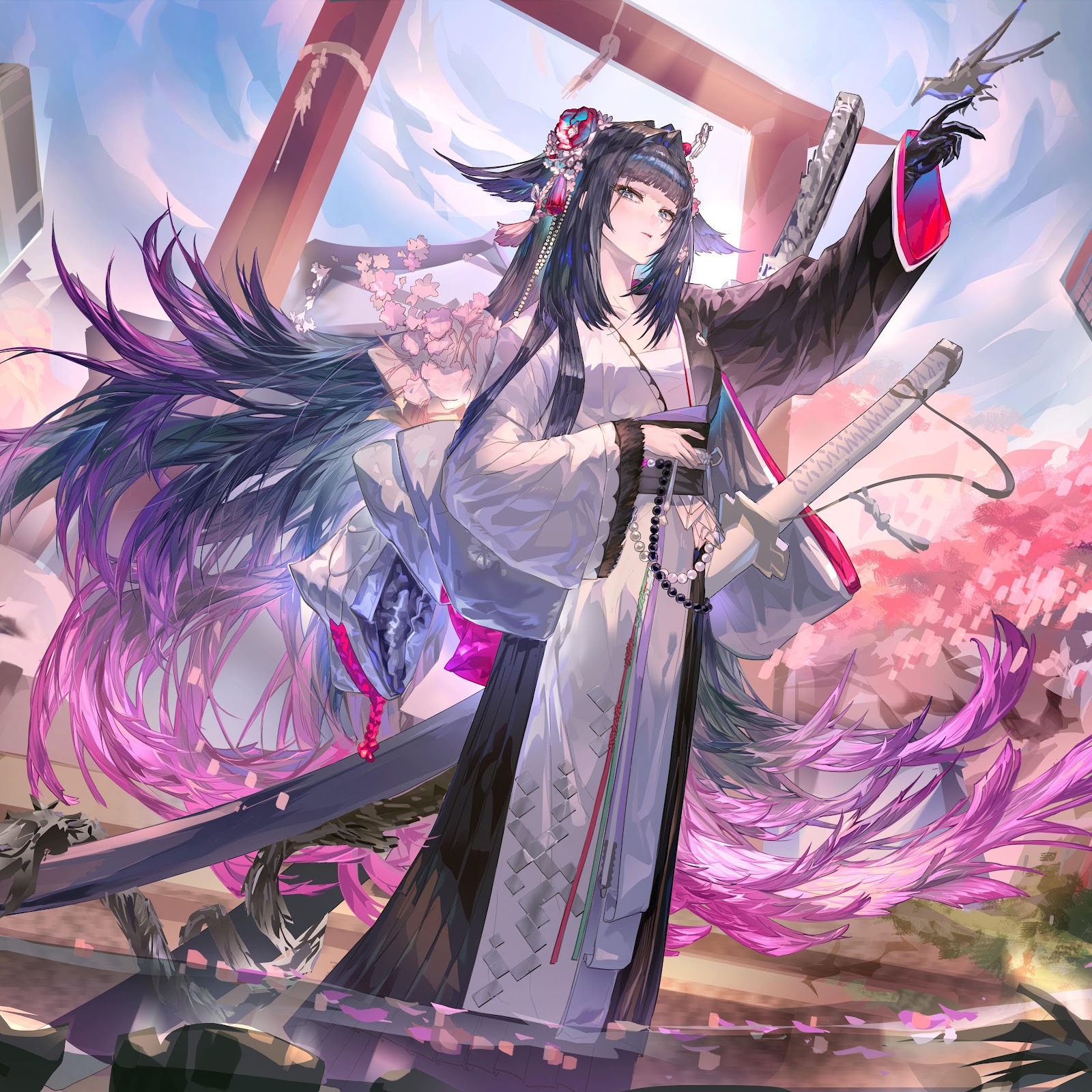 Anime, Fantasy Art, Samurai Girl, Cherry Blossoms 8K Desktop and Mobile Wallpaper Background with a maximum resolution of 9172x4961 px.