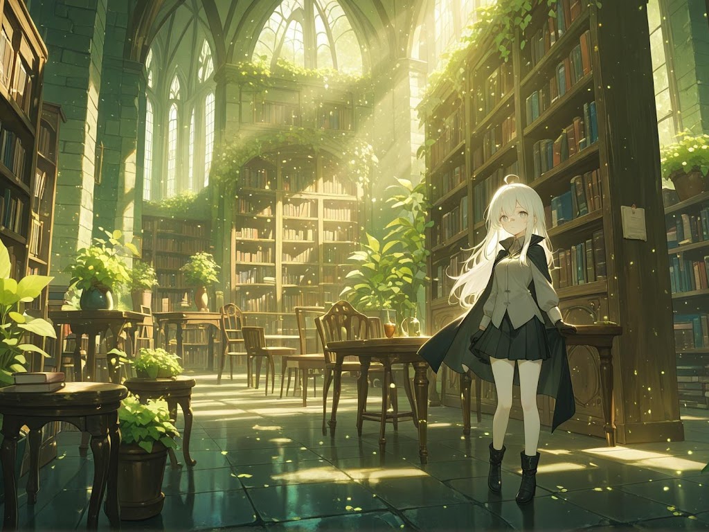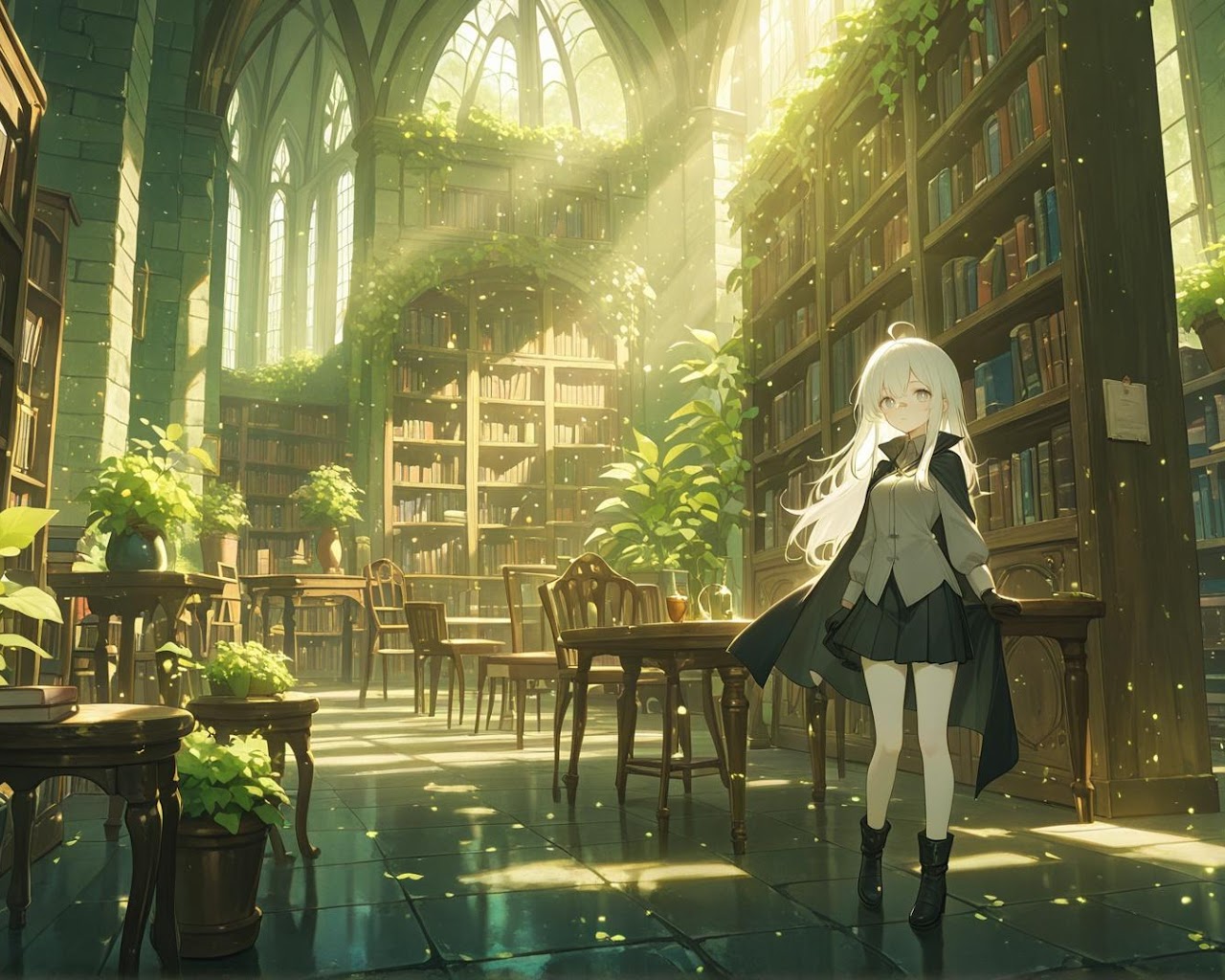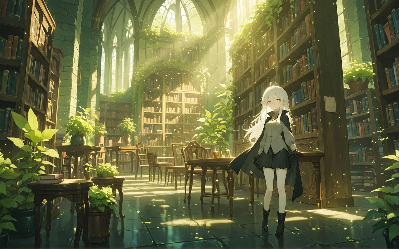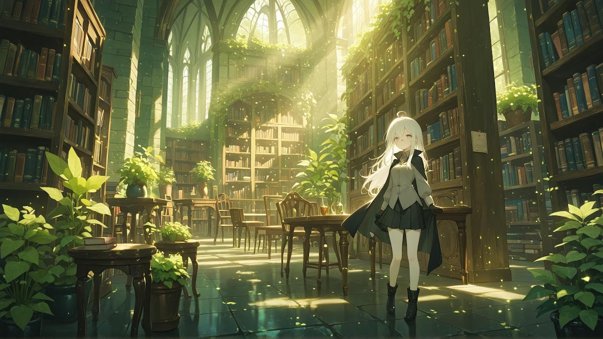 Anime Library, Fantasy Art, Interior Illustration, Girl Character Full HD Desktop and Mobile Wallpaper Background with a maximum resolution of 1920x1080 px.