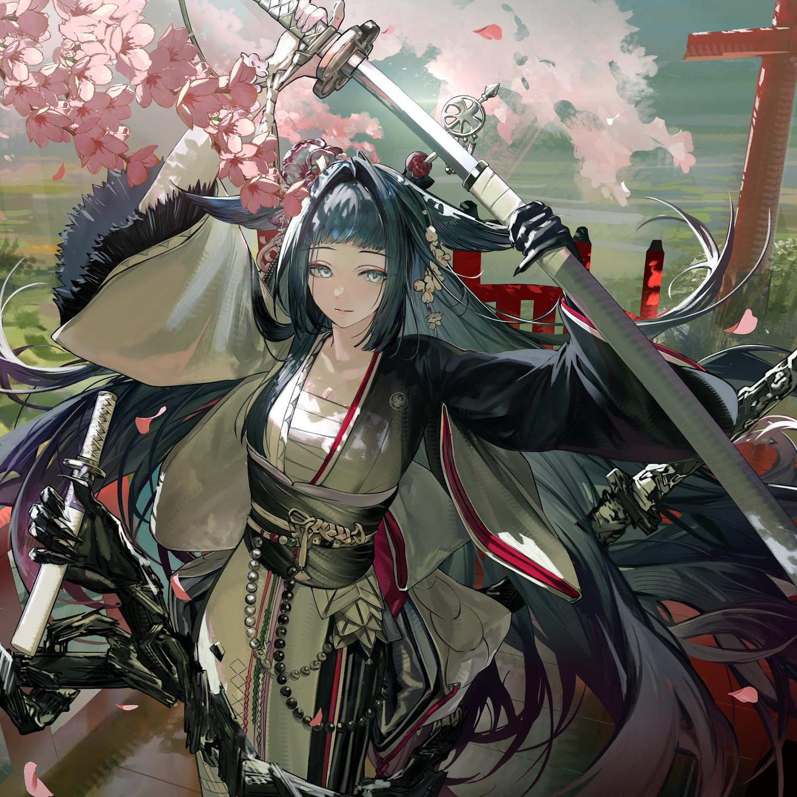 Anime Samurai, Japanese Art, Warrior Girl, Cherry Blossoms 5K Desktop and Mobile Wallpaper Background with a maximum resolution of 6800x3520 px.