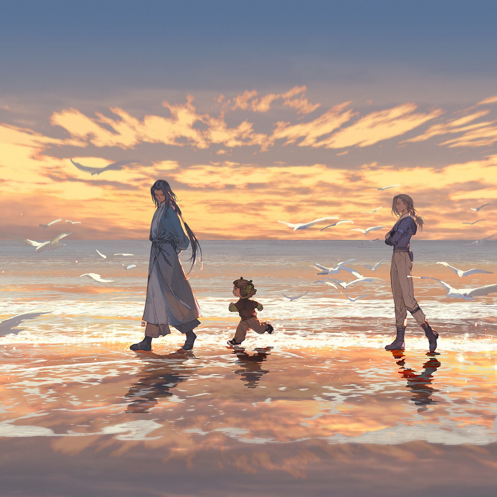 Beach Sunset, Anime Art, Family, Sea Birds Full HD Desktop Wallpaper