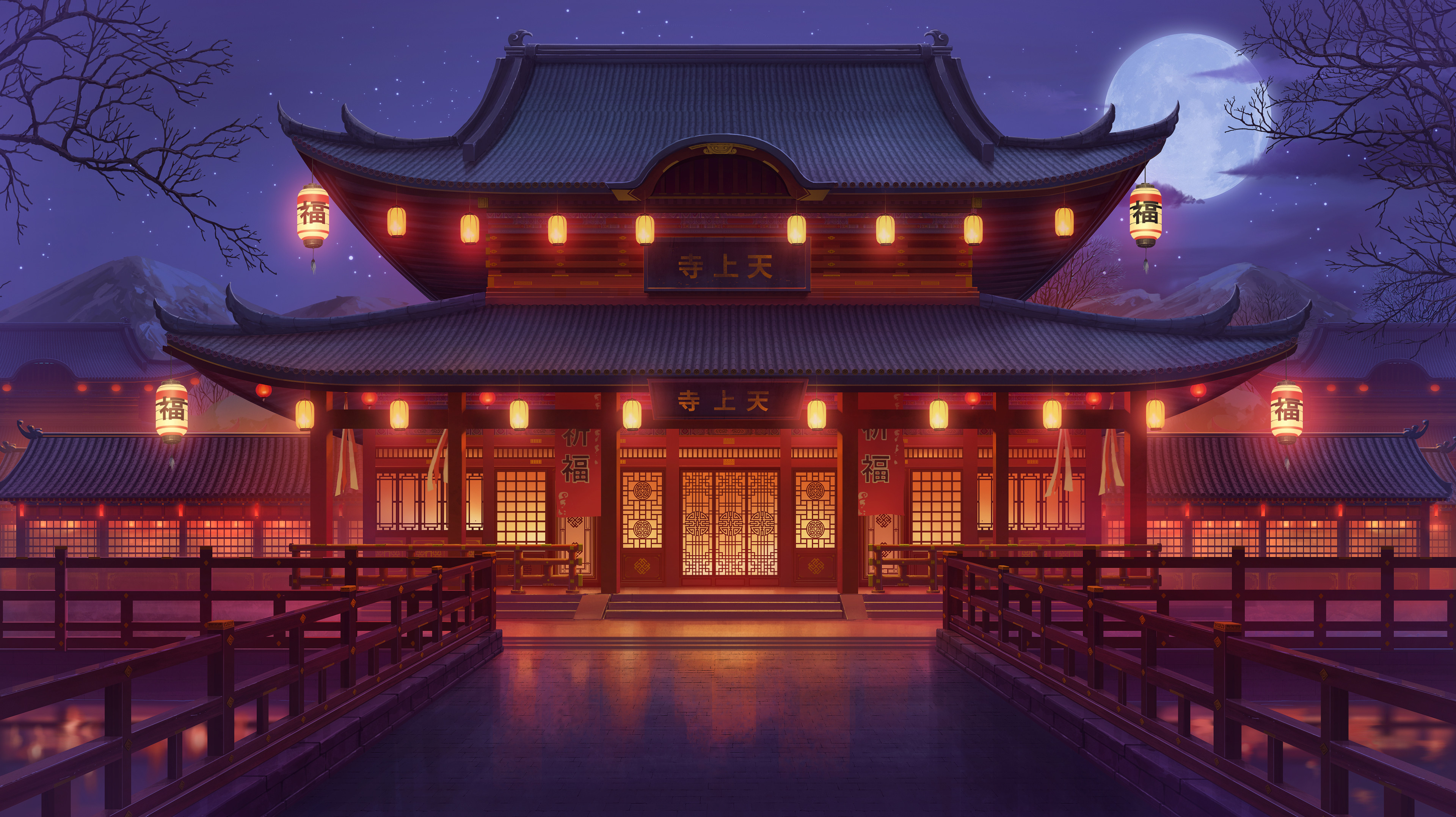 Chinese Architecture, Asian Temple, Night Scene, Oriental Building 2K Desktop and Mobile Wallpaper Background with a maximum resolution of 3840x2155 px.
