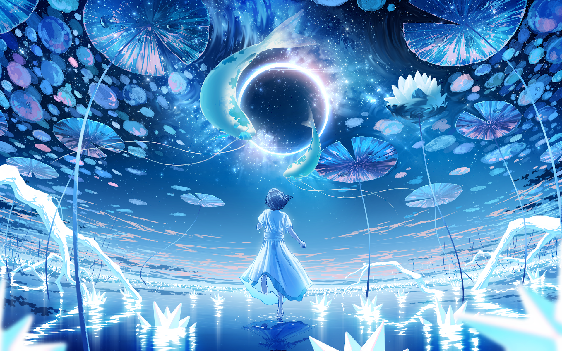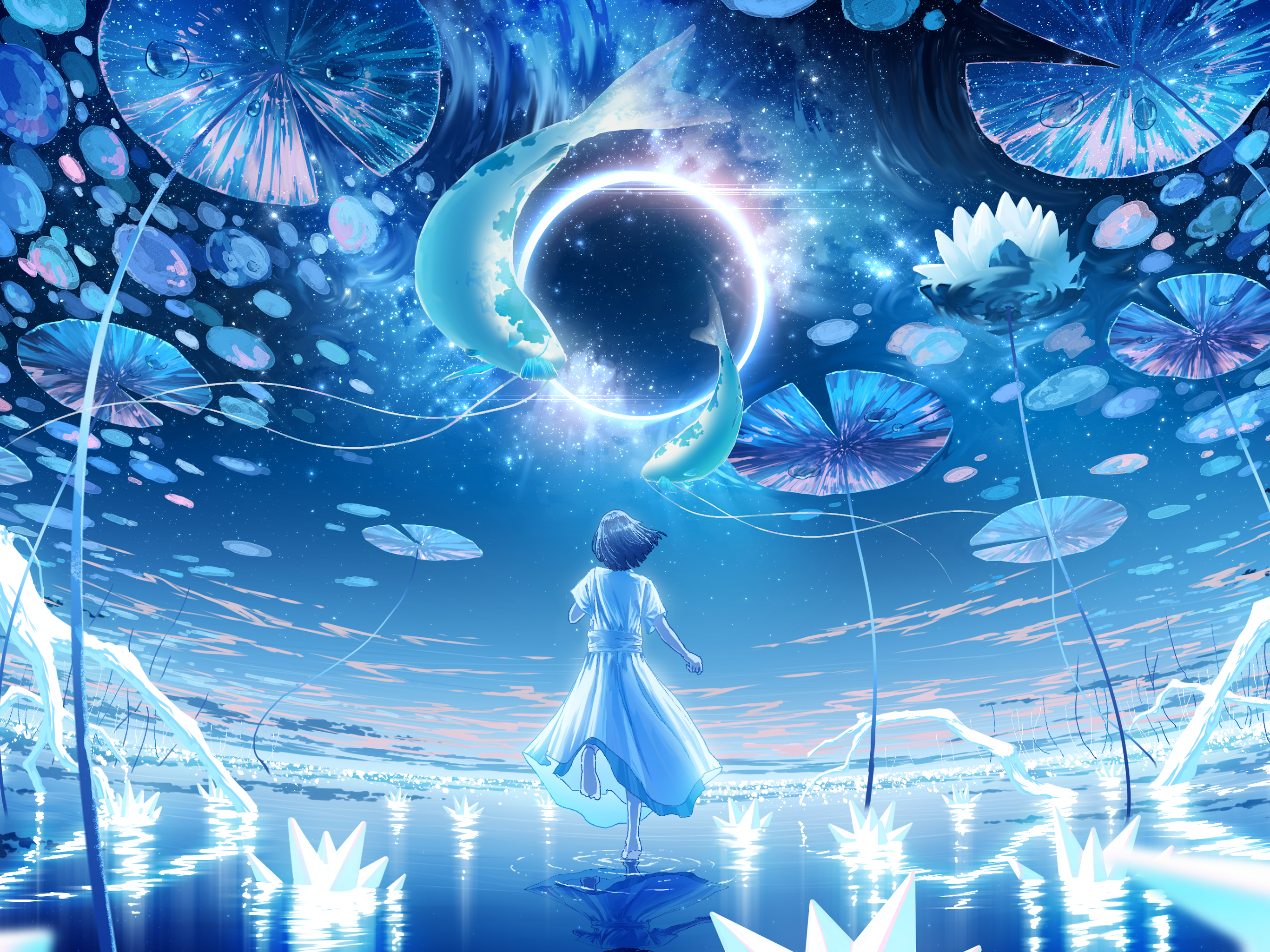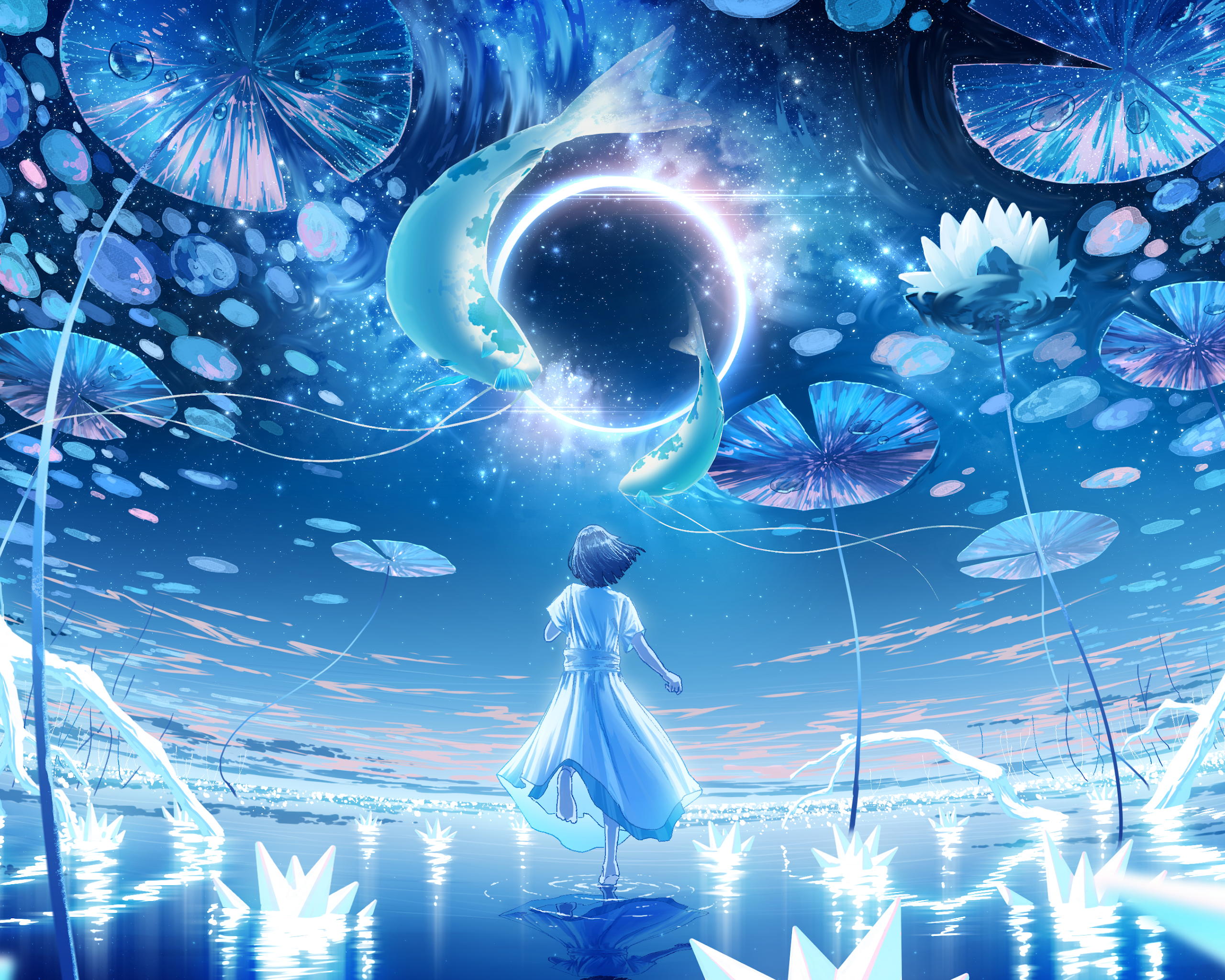 Fantasy Art, Fish Illustration, Water Lilies, Surreal Scene 4K Desktop Wallpaper