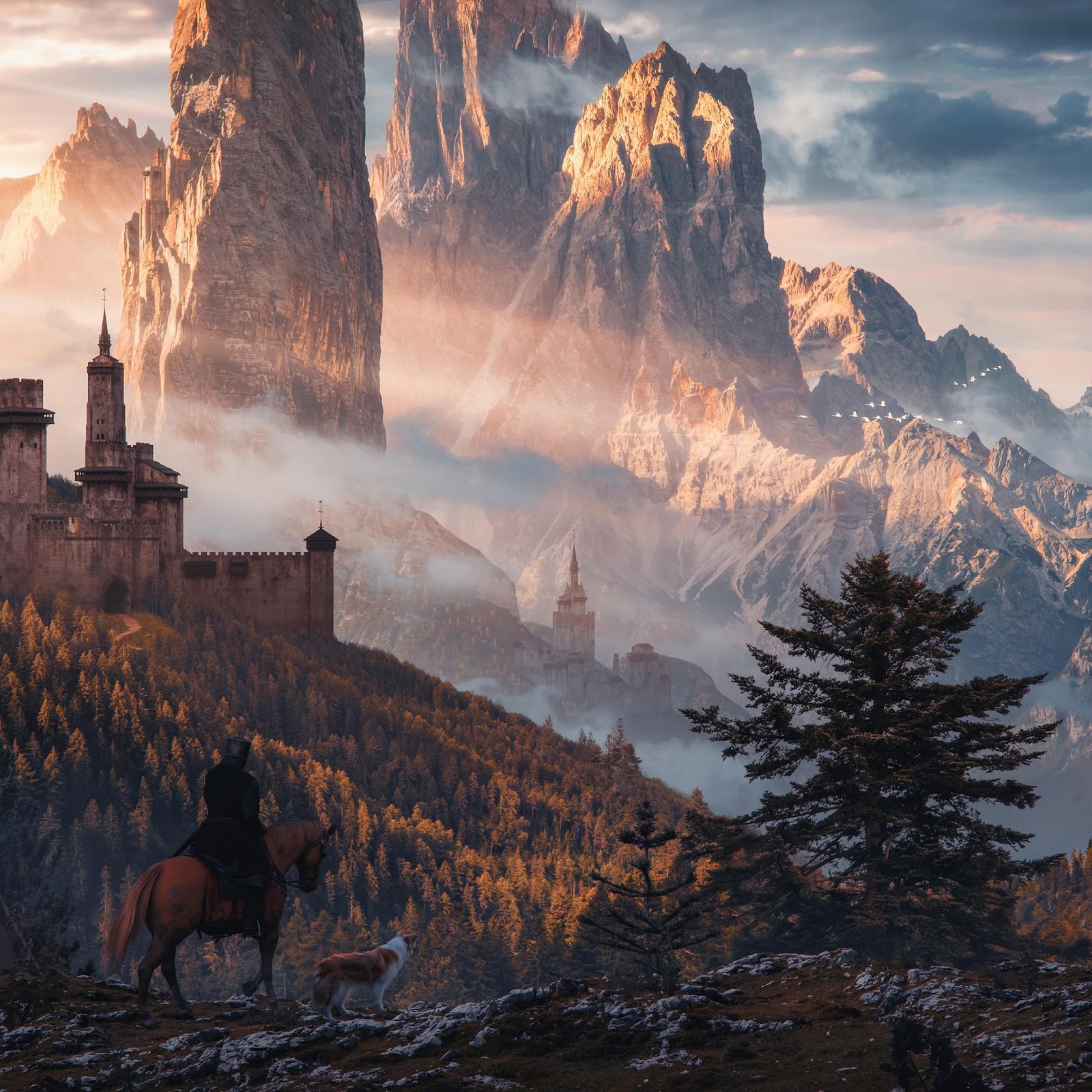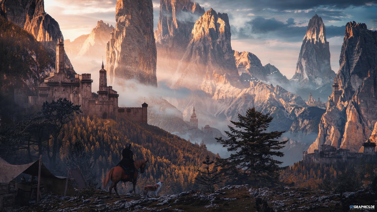 Fantasy Landscape, Mountain Castle, Medieval Art, Horse Rider 4K Desktop Wallpaper