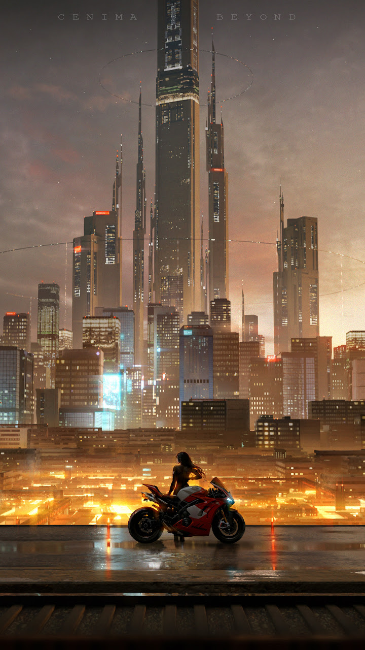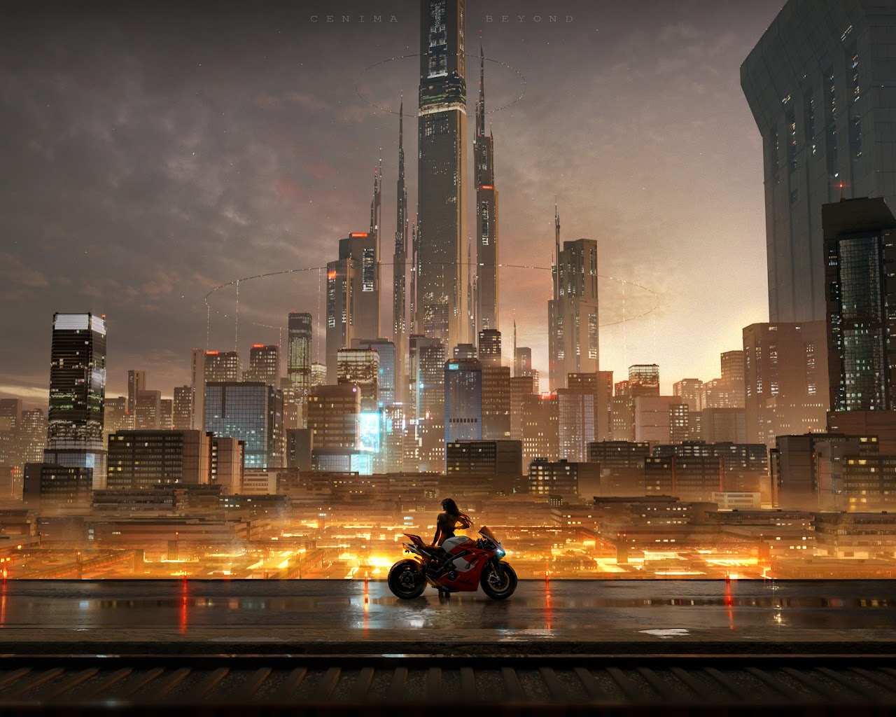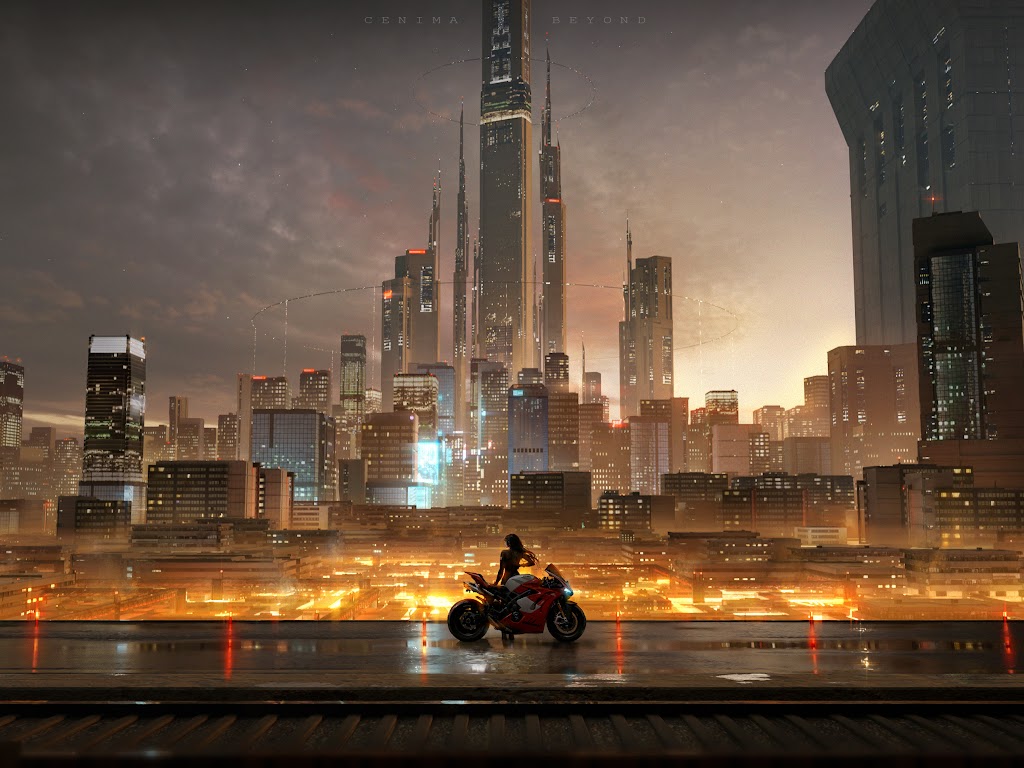 Futuristic Cityscape, Cyberpunk, Sci-Fi, Motorcycle 2K PC Wallpaper