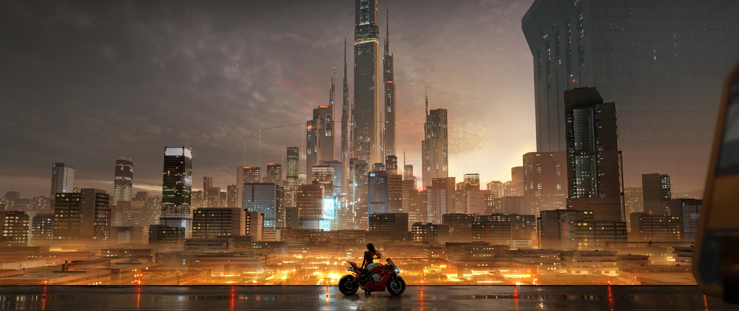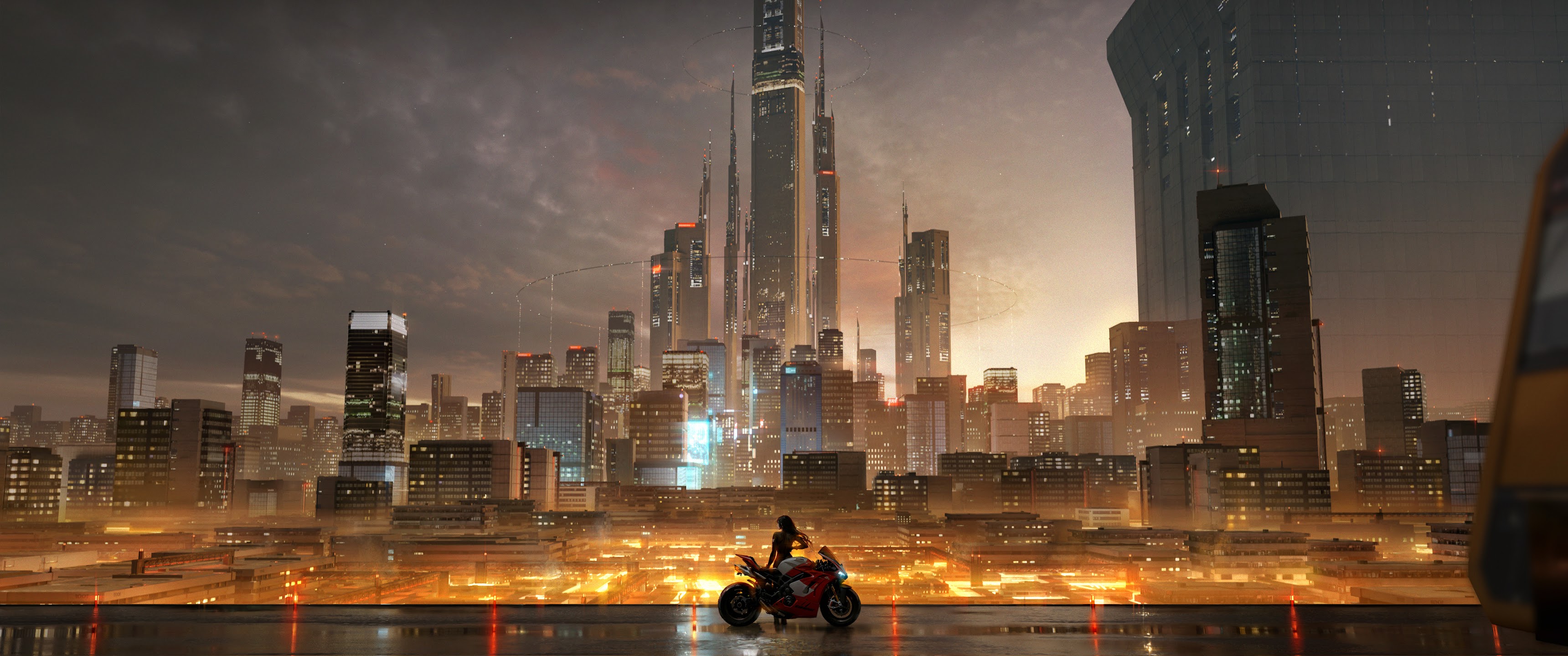 Futuristic Cityscape, Cyberpunk, Sci-Fi, Motorcycle 2K Desktop and Mobile Wallpaper Background with a maximum resolution of 3840x1936 px.