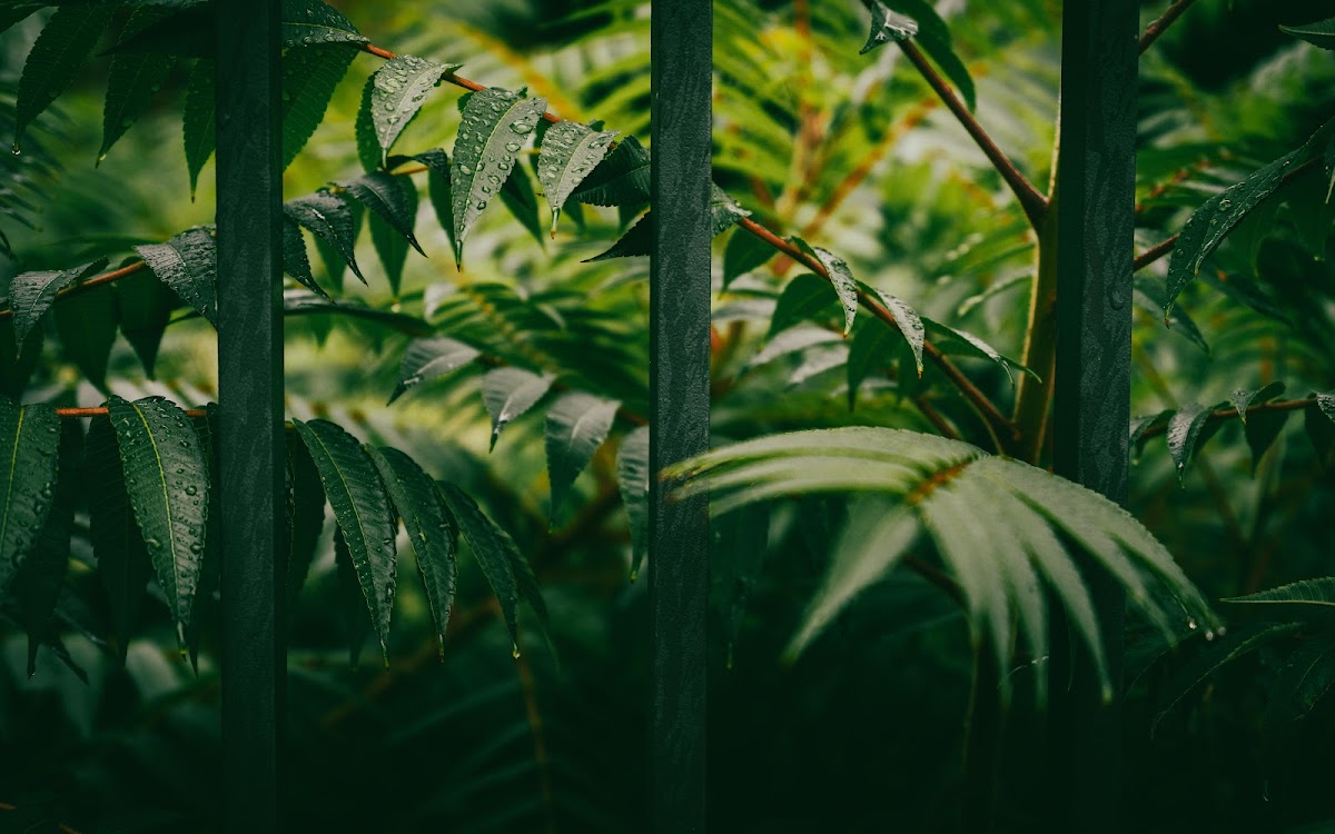Greenery, Foliage, Metal Fence, Raindrops 8K Desktop and Mobile Wallpaper Background with a maximum resolution of 8255x5160 px.