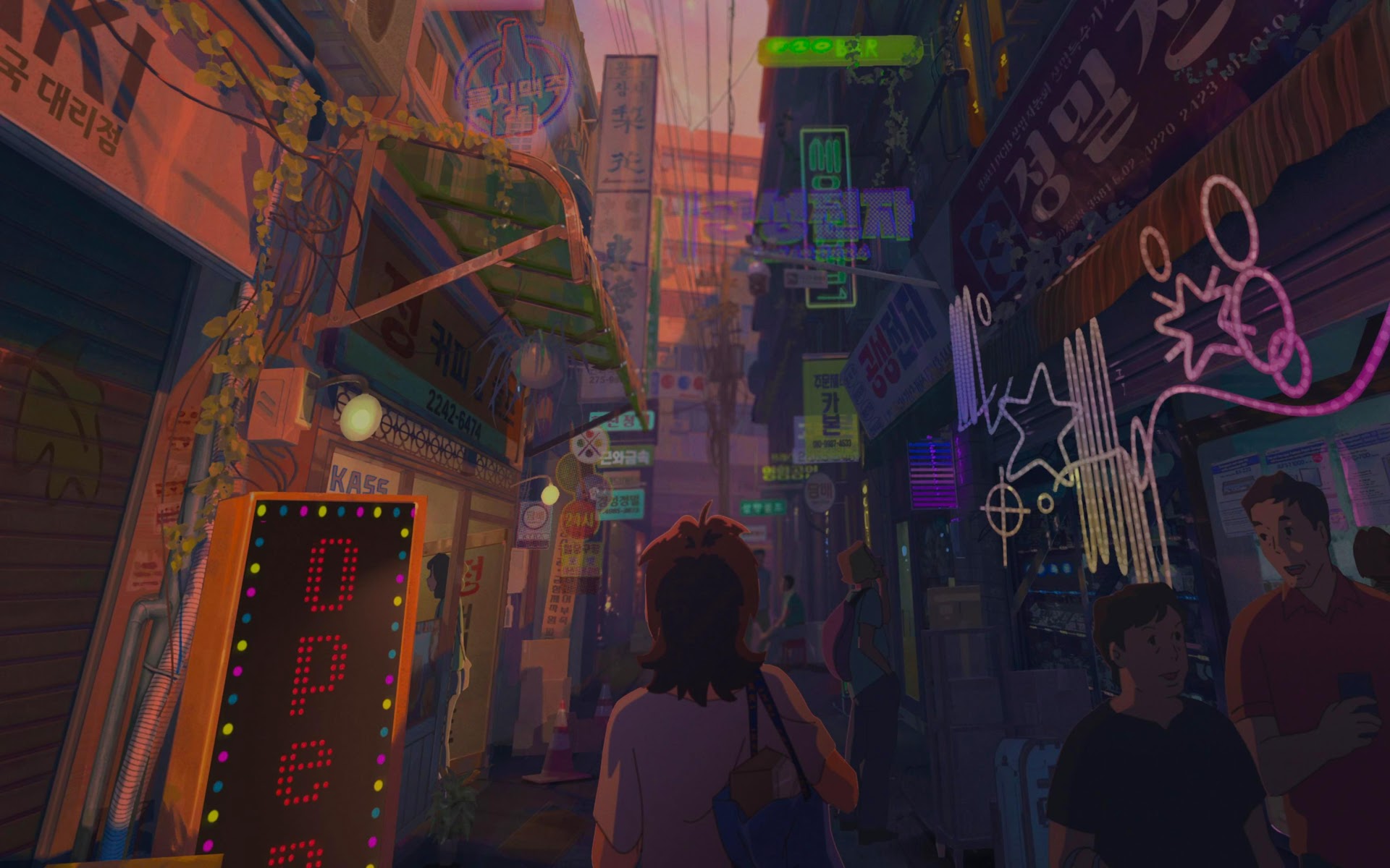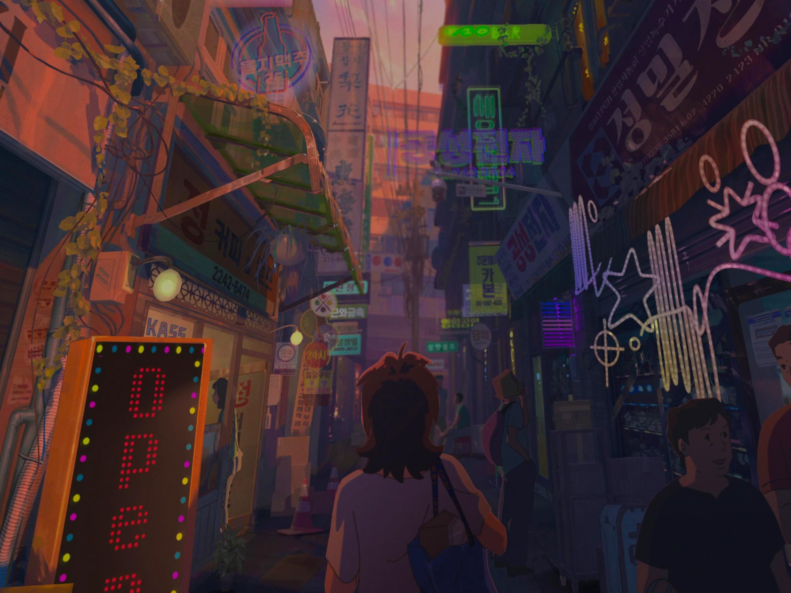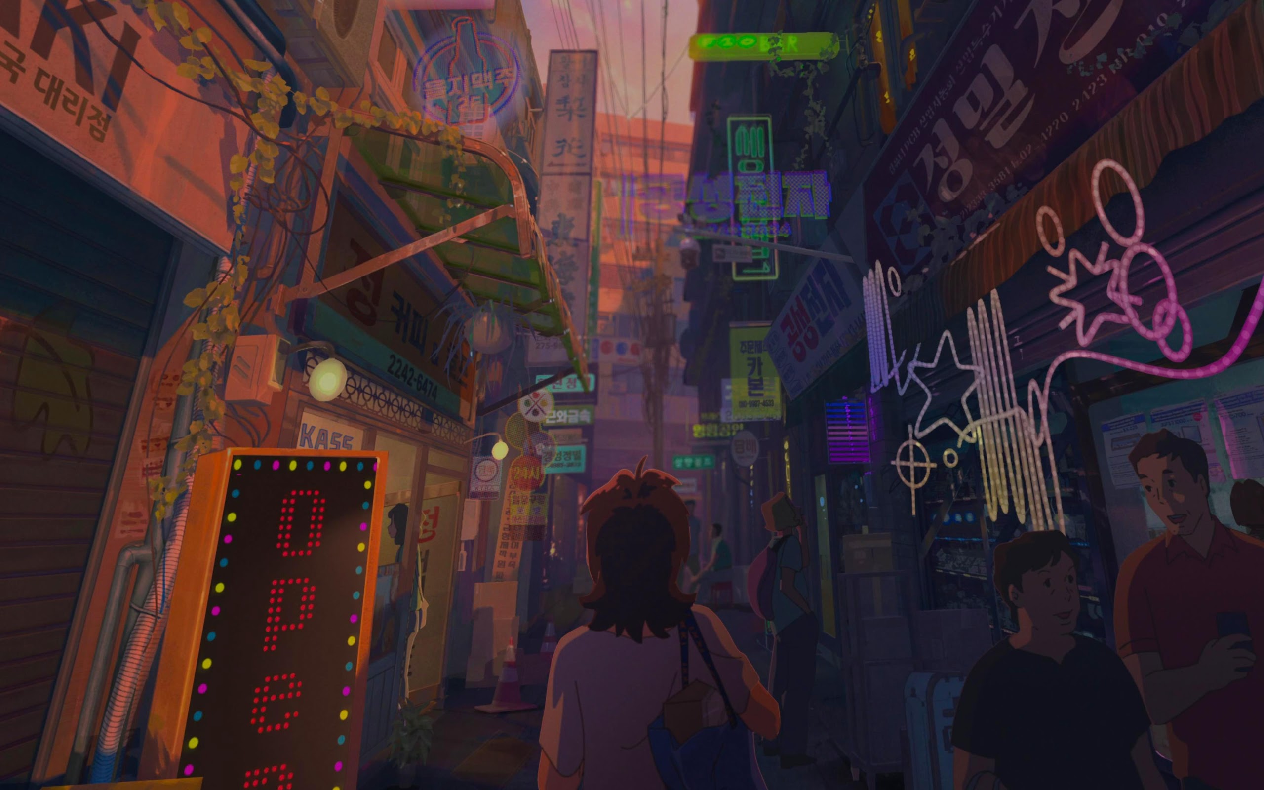 Korean Street, Cartoon, Neon Lights, Cityscape 4K Desktop and Mobile Wallpaper Background with a maximum resolution of 3840x2160 px.