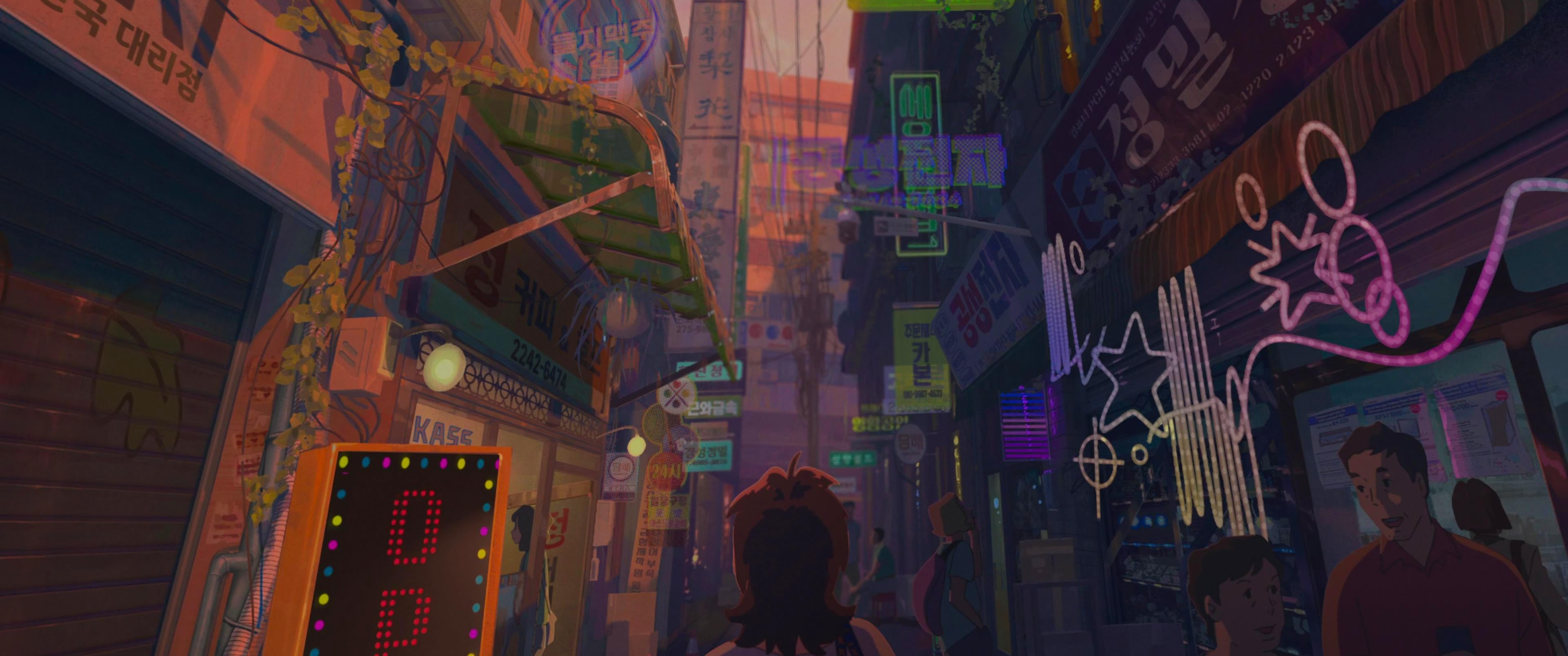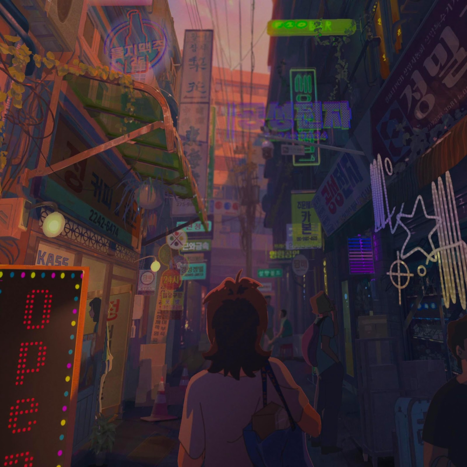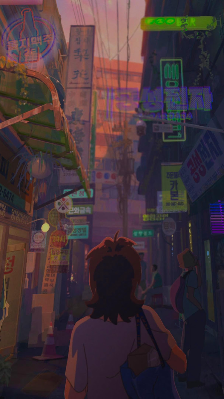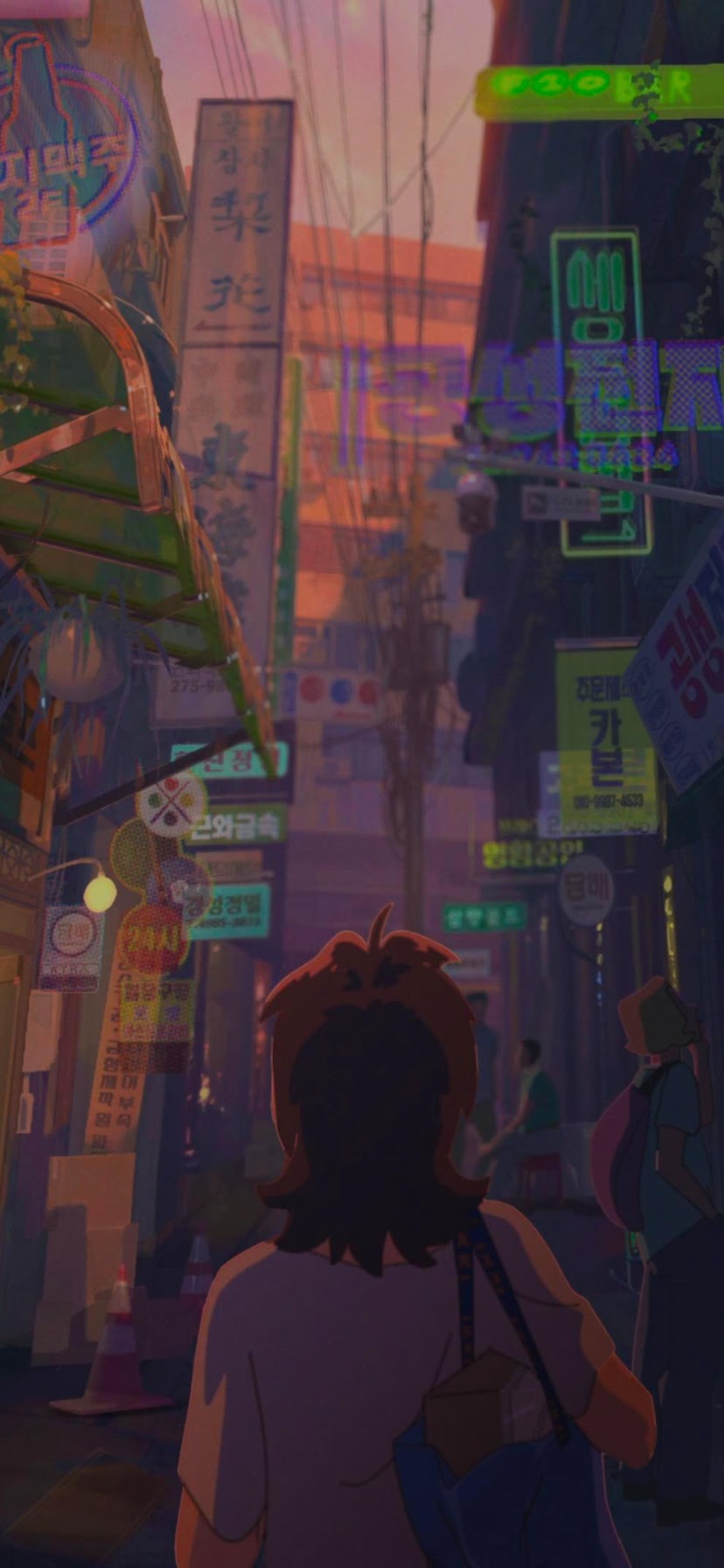 Korean Street, Cartoon, Neon Lights, Cityscape 4K Desktop and Mobile Wallpaper Background with a maximum resolution of 3840x2160 px.