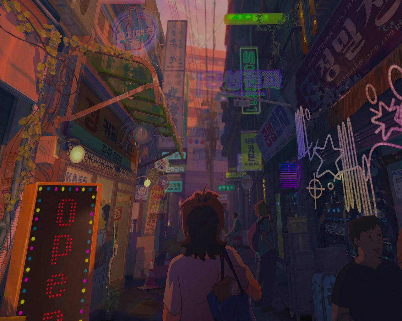 Korean Street, Cartoon, Neon Lights, Cityscape 4K Wallpaper Background (3840x2160)