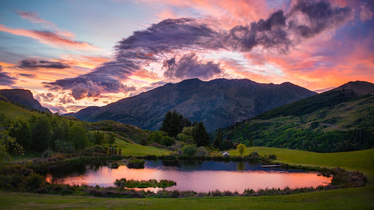 Landscape, Sunset, Mountains, Pond 4K Desktop Wallpaper