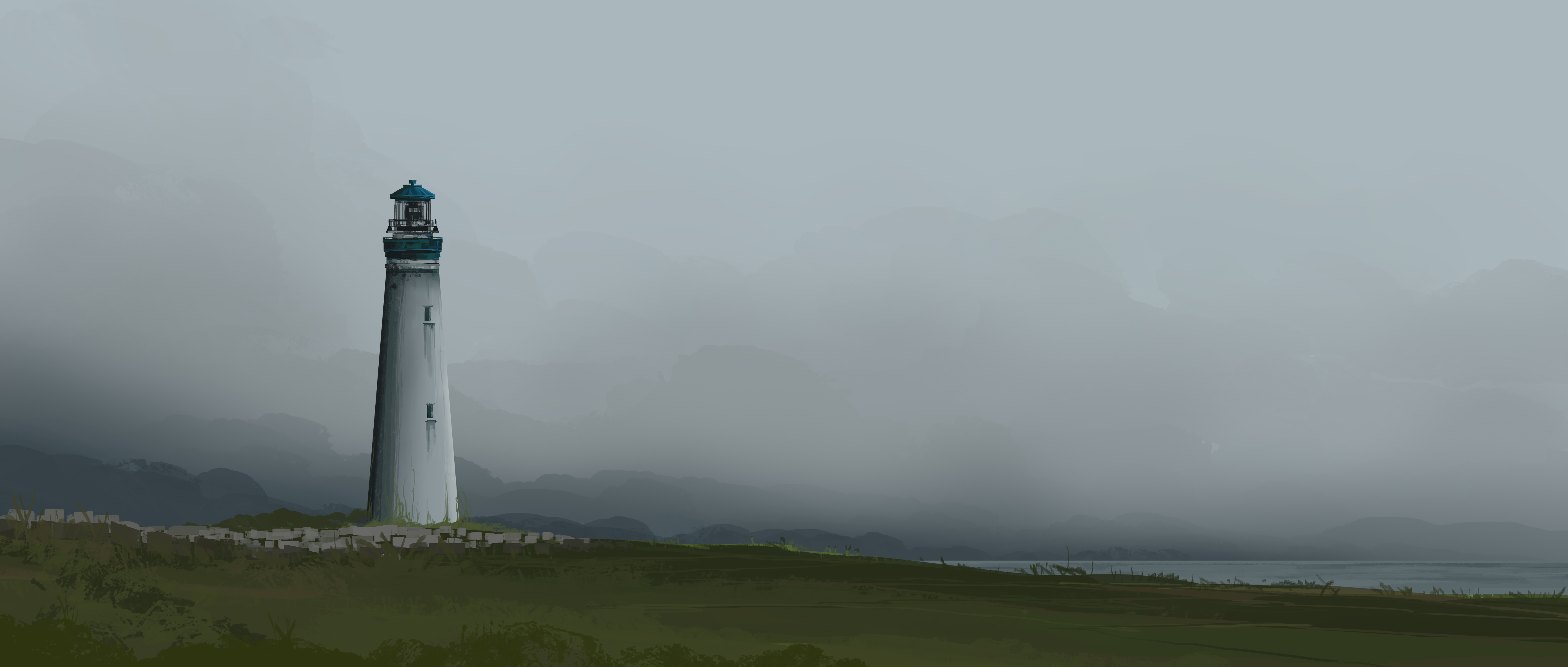 Lighthouse, Coastal, Seascape, Foggy 4K Ultrawide Desktop and Mobile Wallpaper Background with a maximum resolution of 5640x2400 px.