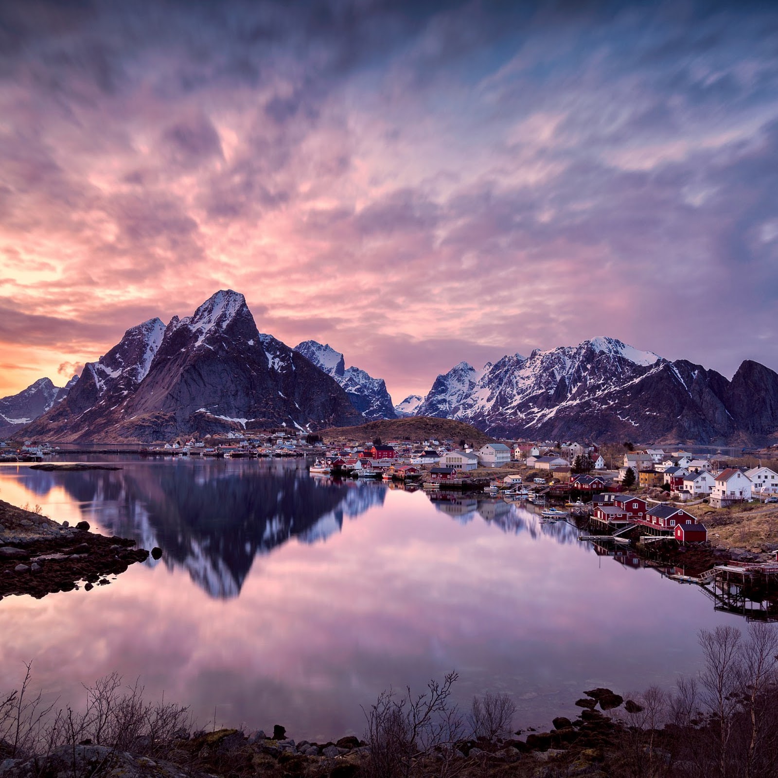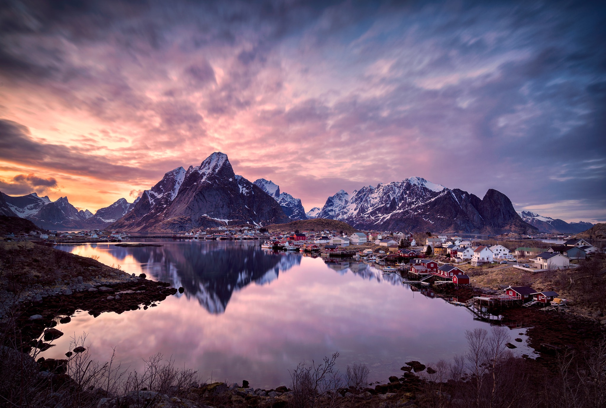 Lofoten Islands, Norway, Mountain Landscape, Scenic Reflection Full HD Desktop and Mobile Wallpaper Background with a maximum resolution of 2048x1378 px.