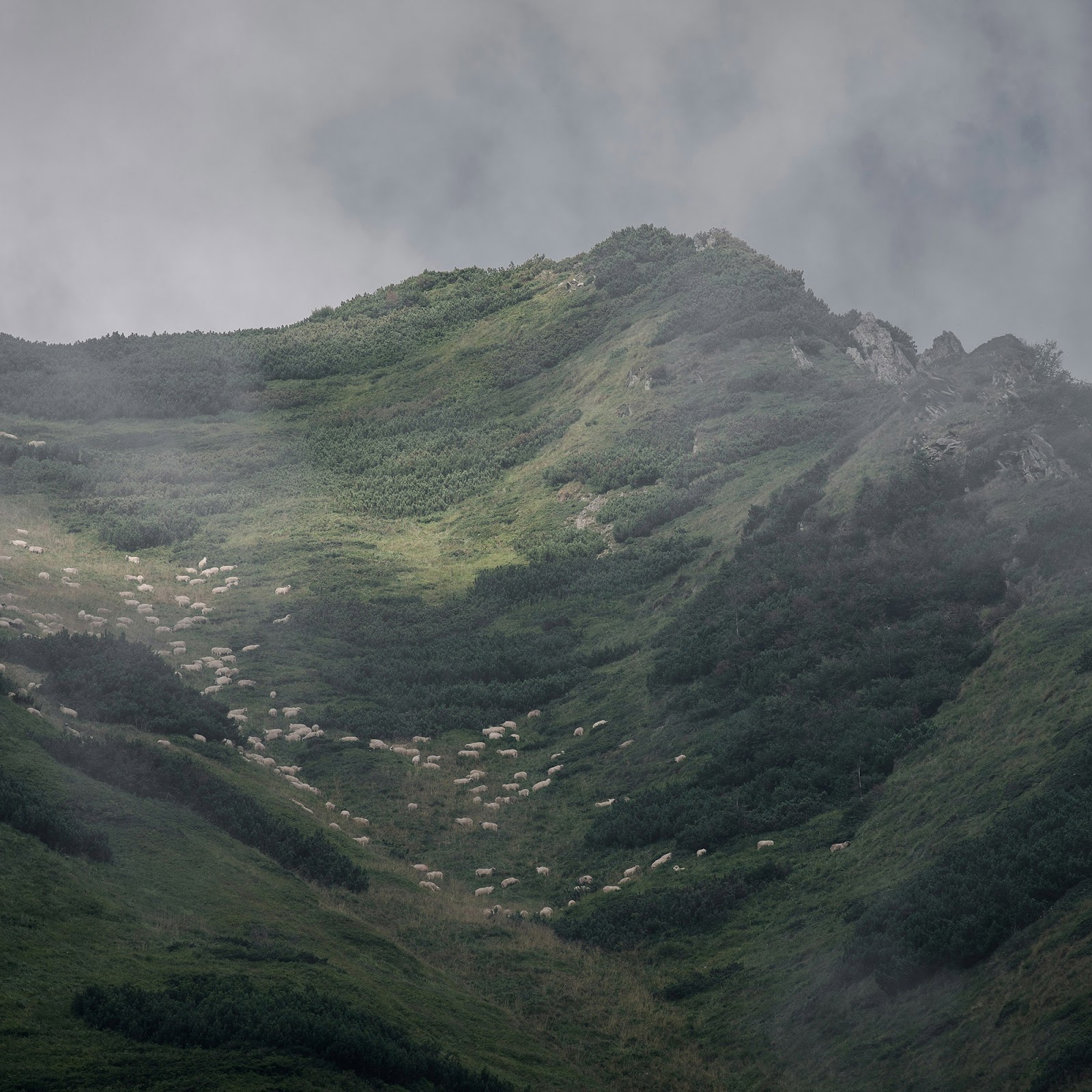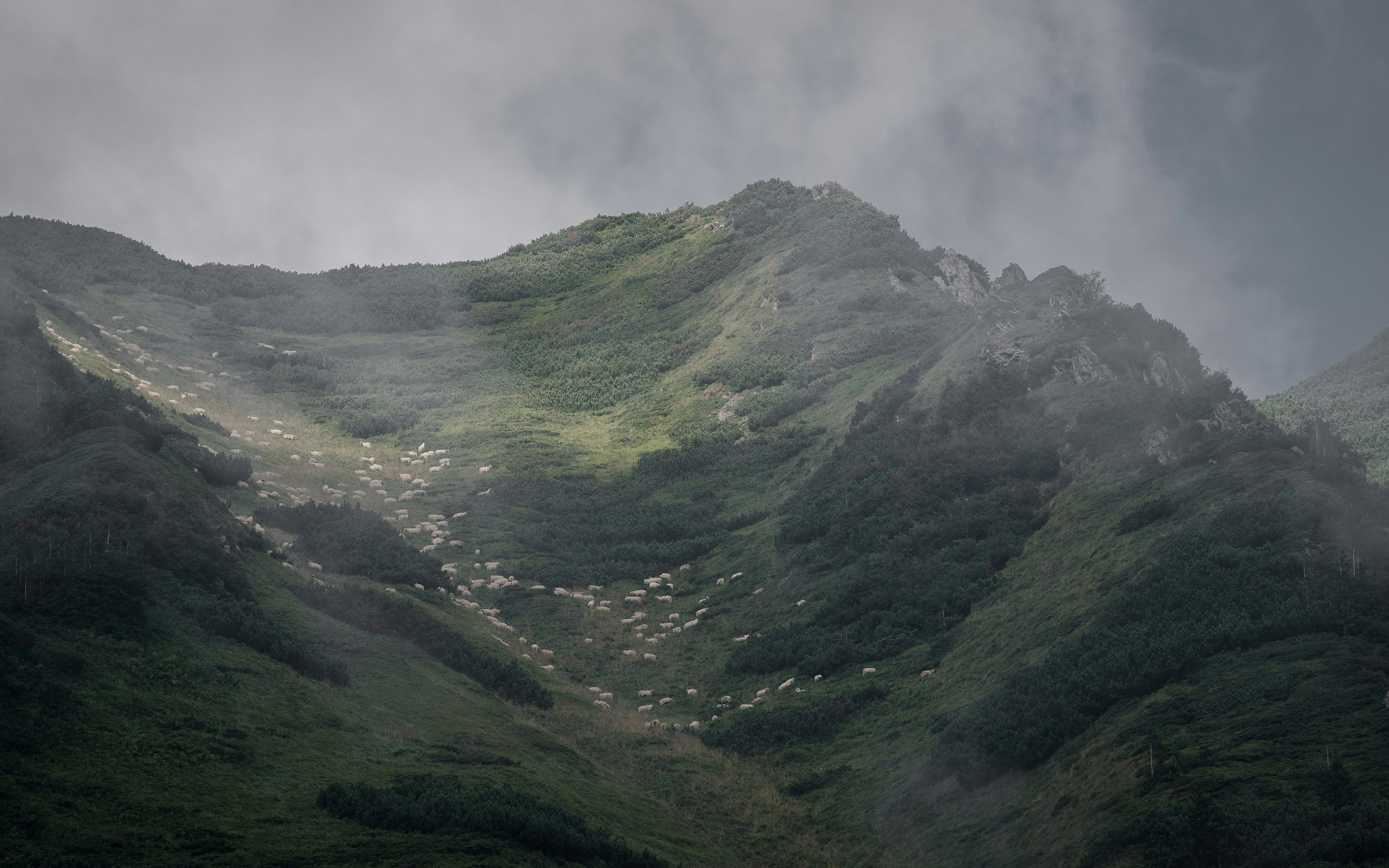 Mountain Landscape, Sheep, Fog, Hillside 2K Desktop and Mobile Wallpaper Background with a maximum resolution of 3200x2000 px.
