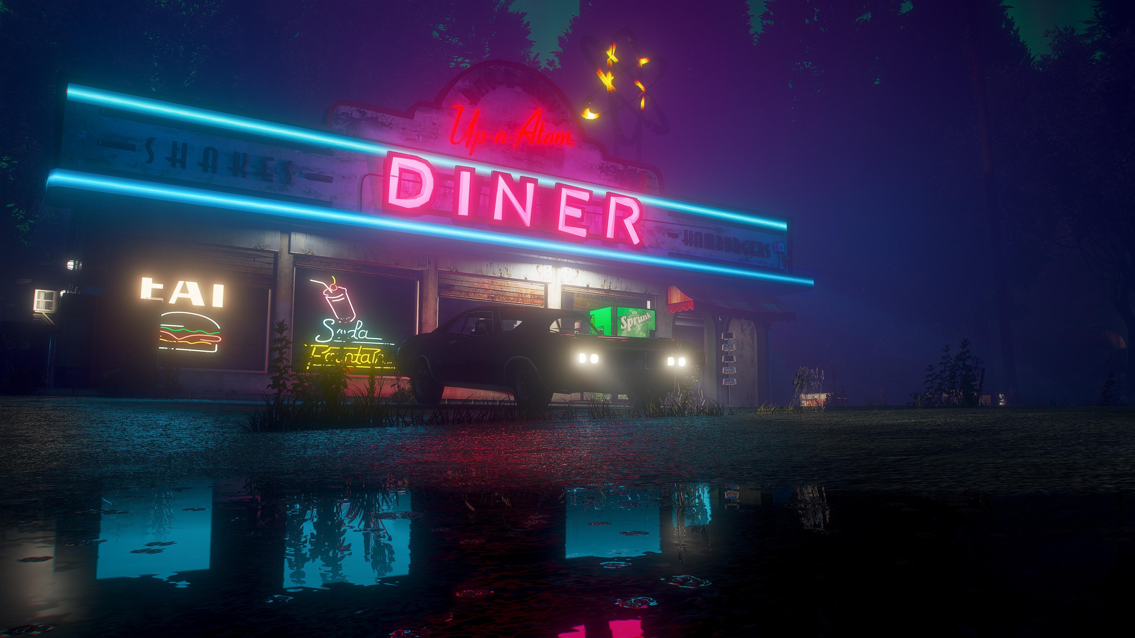 Neon Diner, Night Scene, Retro, American Roadside 4K Desktop and Mobile Wallpaper Background with a maximum resolution of 3840x2160 px.