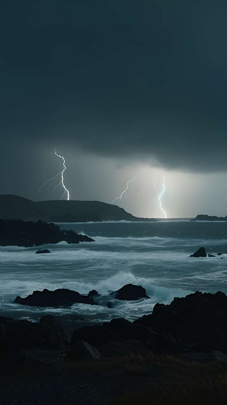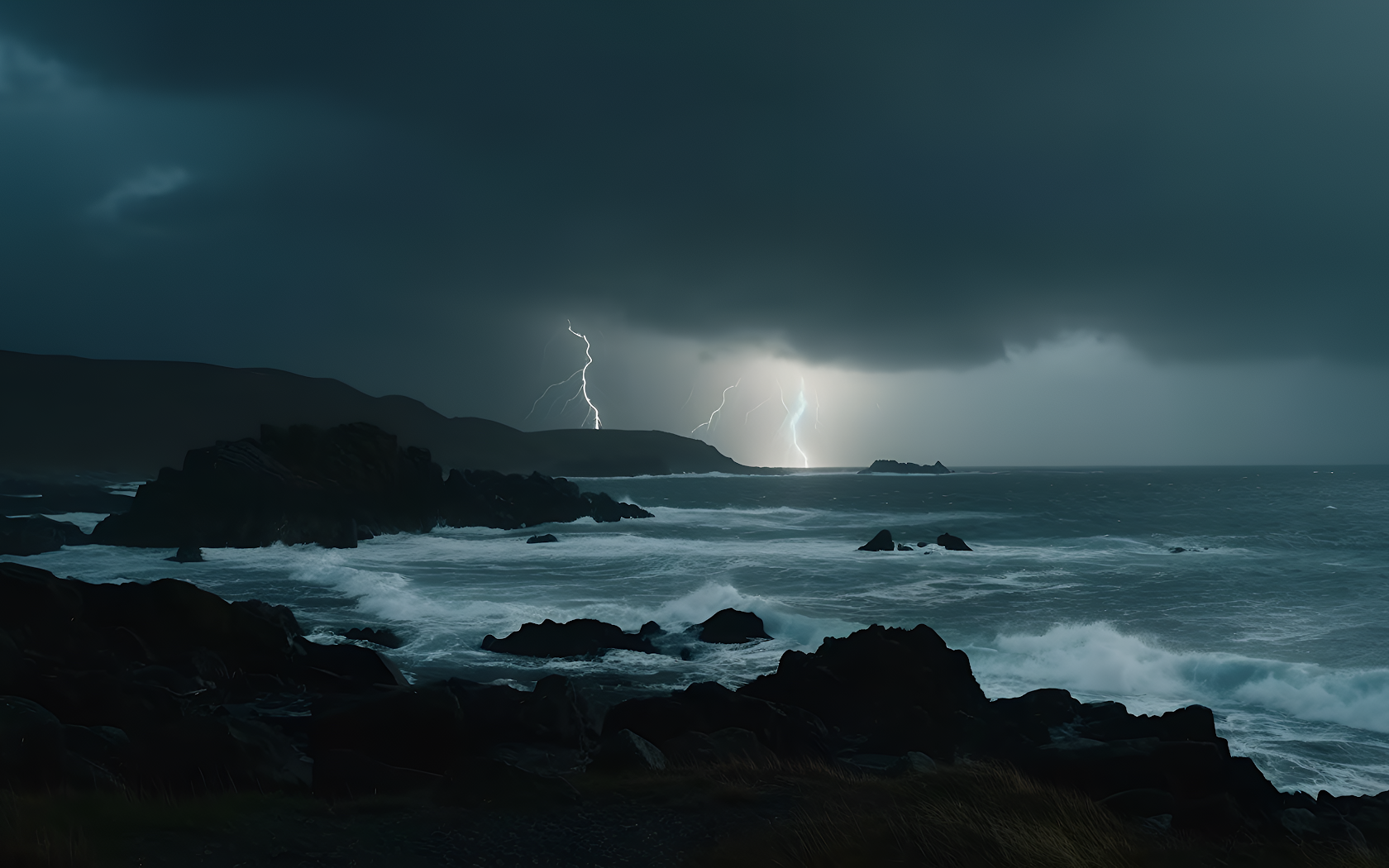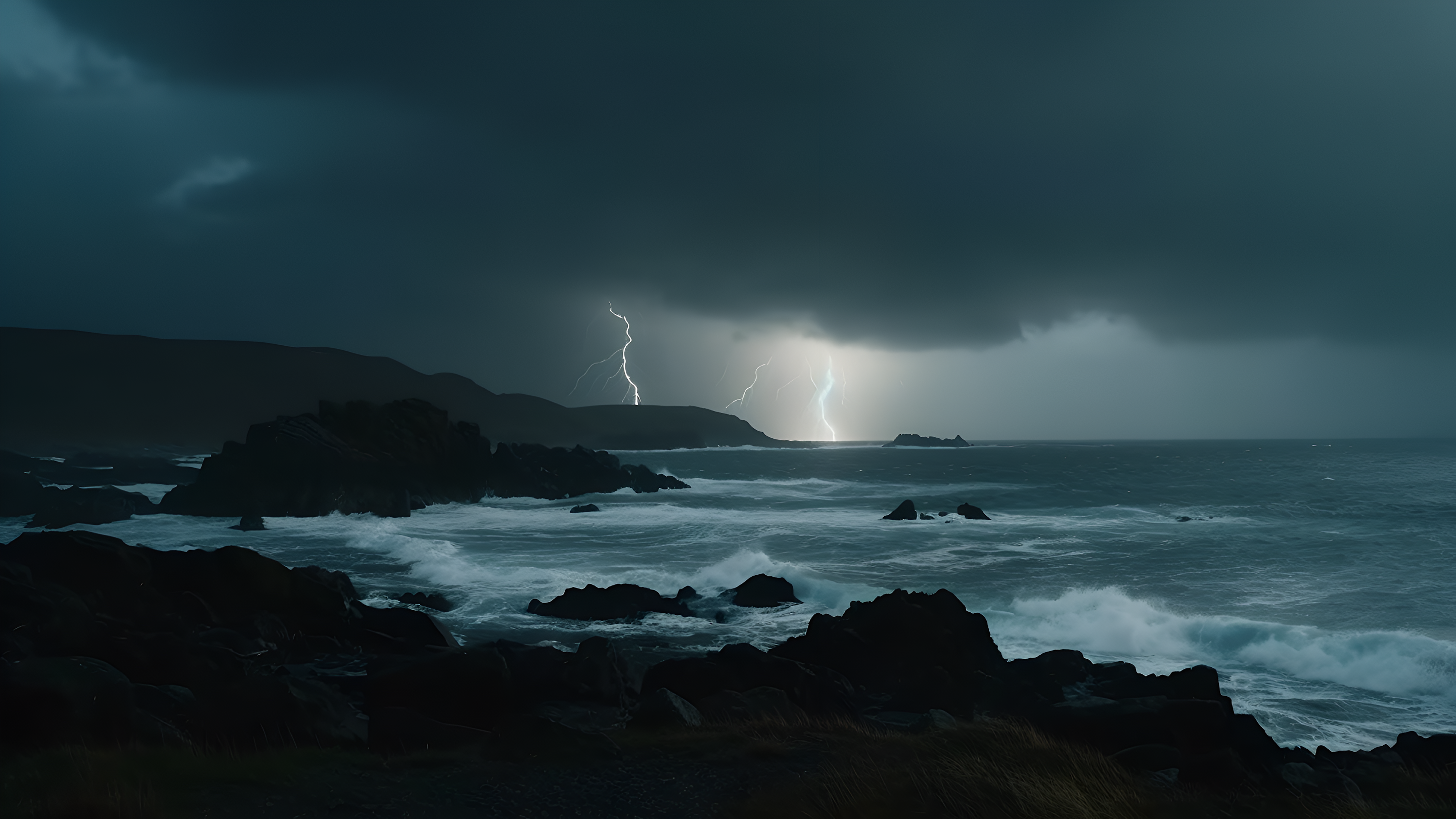 Stormy Seascape, Lightning Strike, Coastal Landscape, Dramatic Weather 4K Wallpaper Background (3840x2160)
