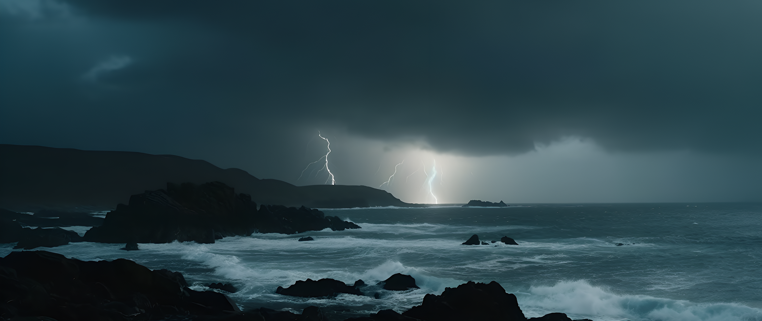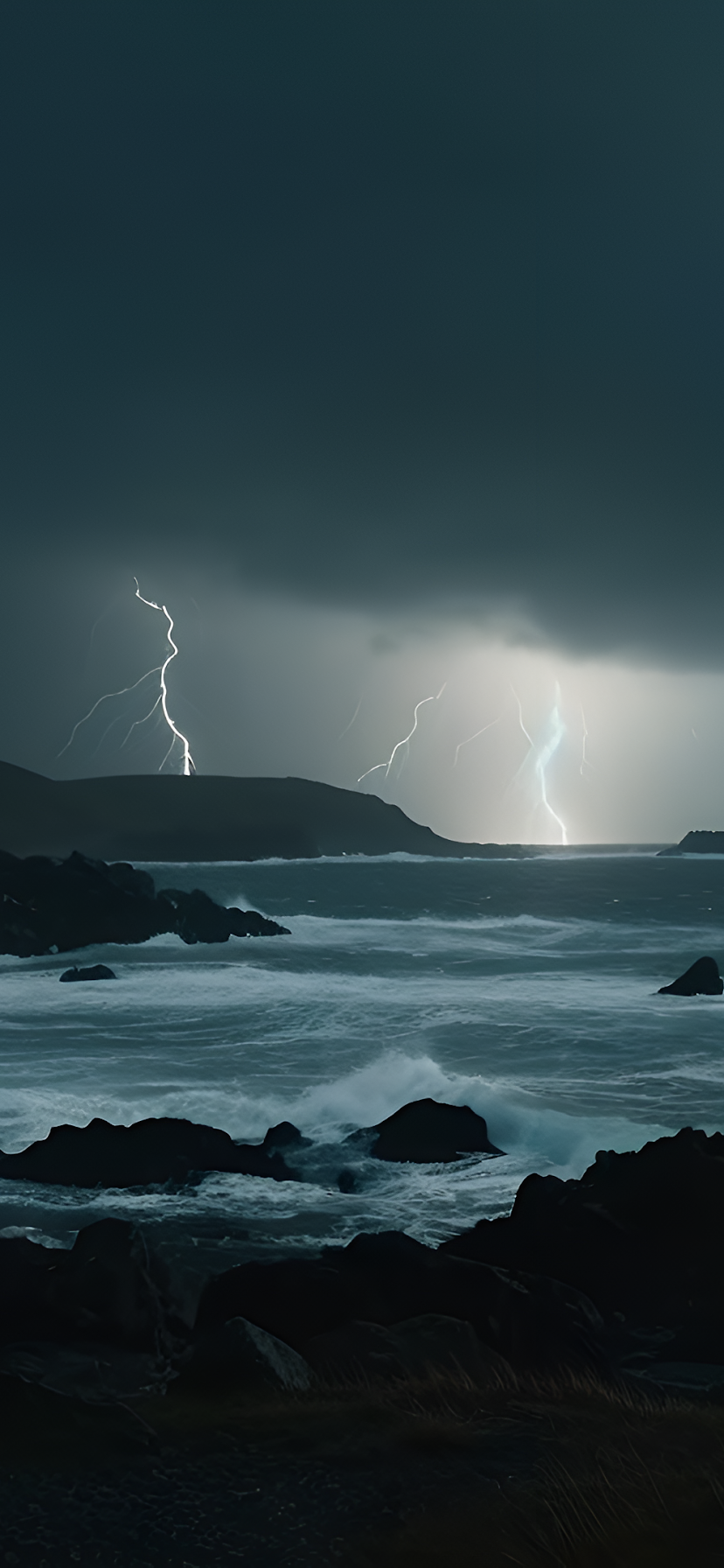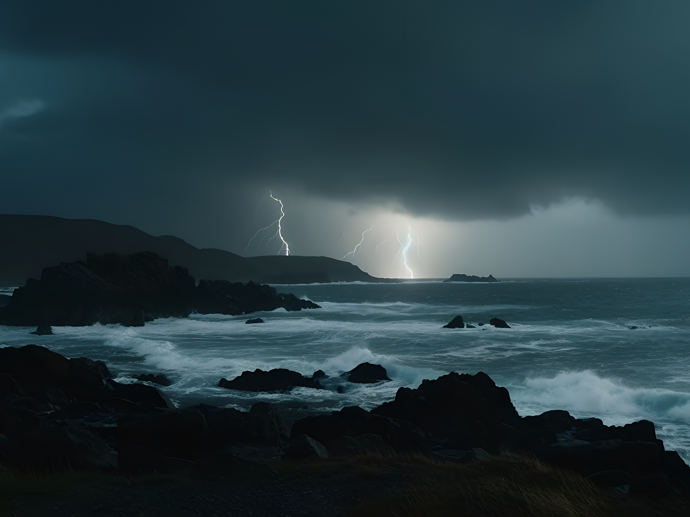 Stormy Seascape, Lightning Strike, Coastal Landscape, Dramatic Weather 4K Wallpaper Background (3840x2160)
