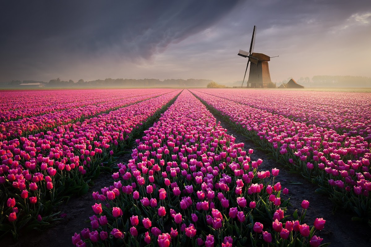 Tulip Field, Netherlands, Windmill, Flower Landscape Desktop and Mobile Wallpaper Background with a maximum resolution of 1800x1200 px.