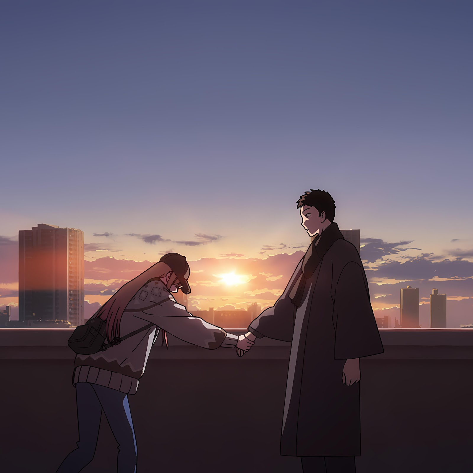 Anime Couple, Sunset Cityscape, Rooftop View, Holding Hands 8K Desktop Wallpaper