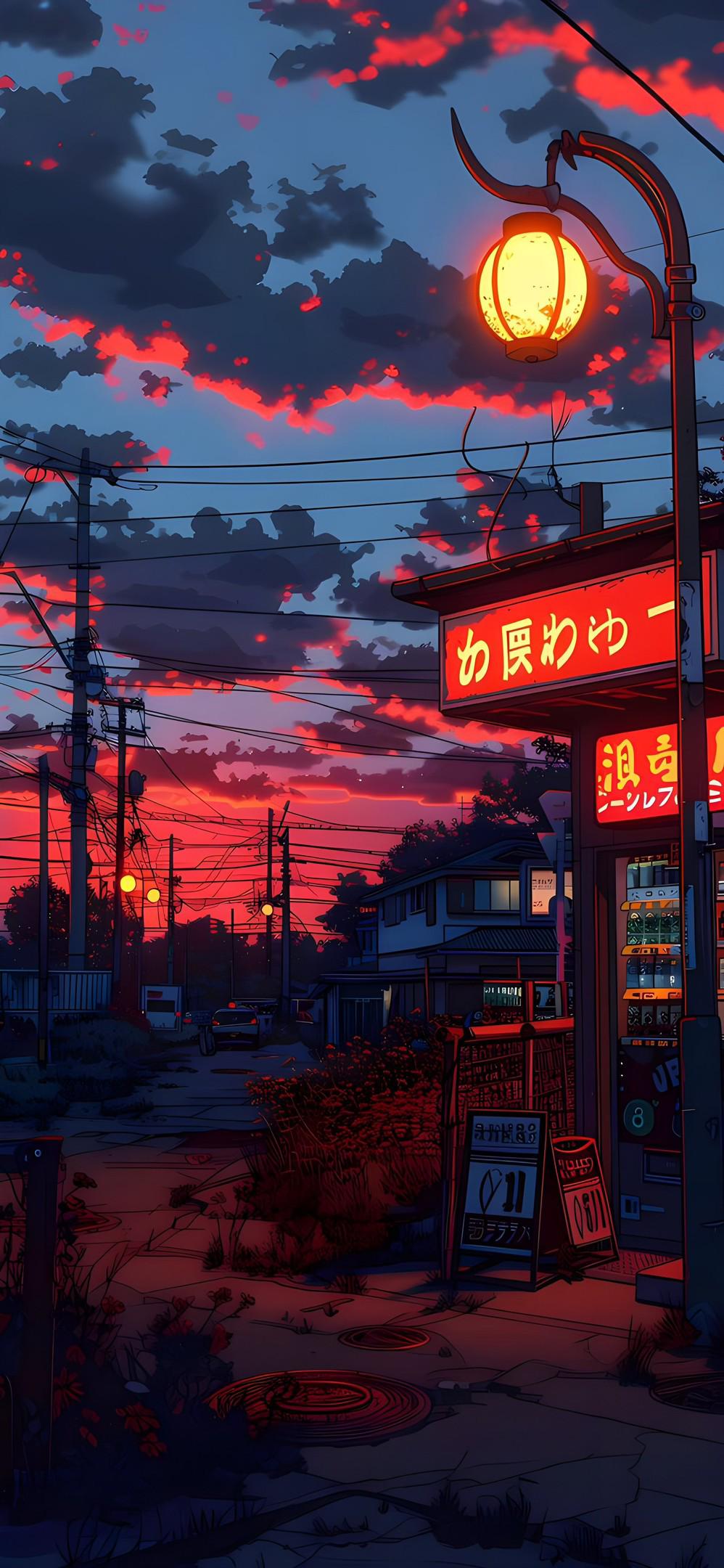 Anime Scenery, Cityscape, Japanese Street, Evening Glow iPhone Wallpaper Background with a maximum resolution of 998x2160 px.