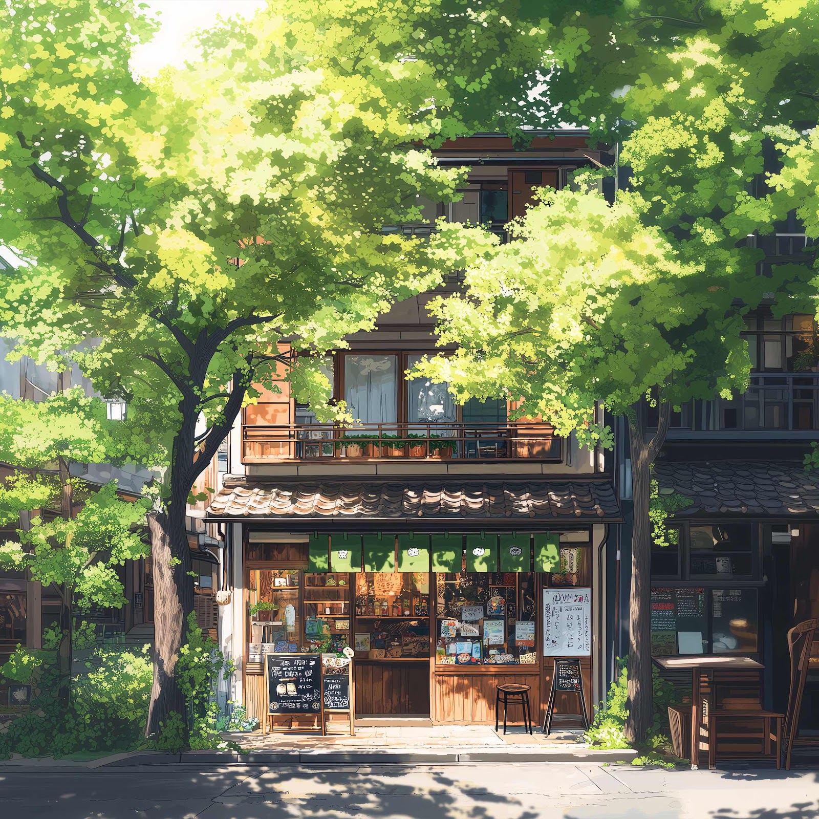 Anime Street, Cozy Cafe, Japanese Architecture, Lush Greenery 4K Desktop and Mobile Wallpaper Background with a maximum resolution of 4096x2304 px.