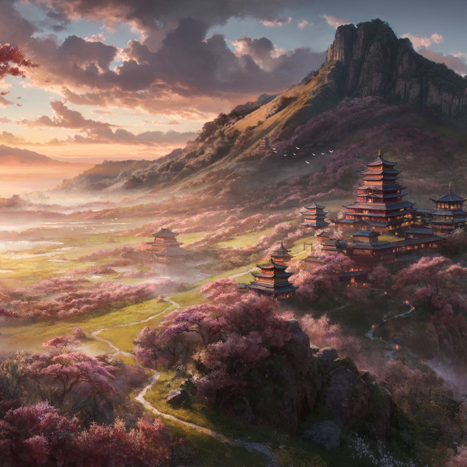 Asian Landscape, Cherry Blossoms, Mountain Scenery, Temple Architecture Full HD Ultrawide Desktop Wallpaper