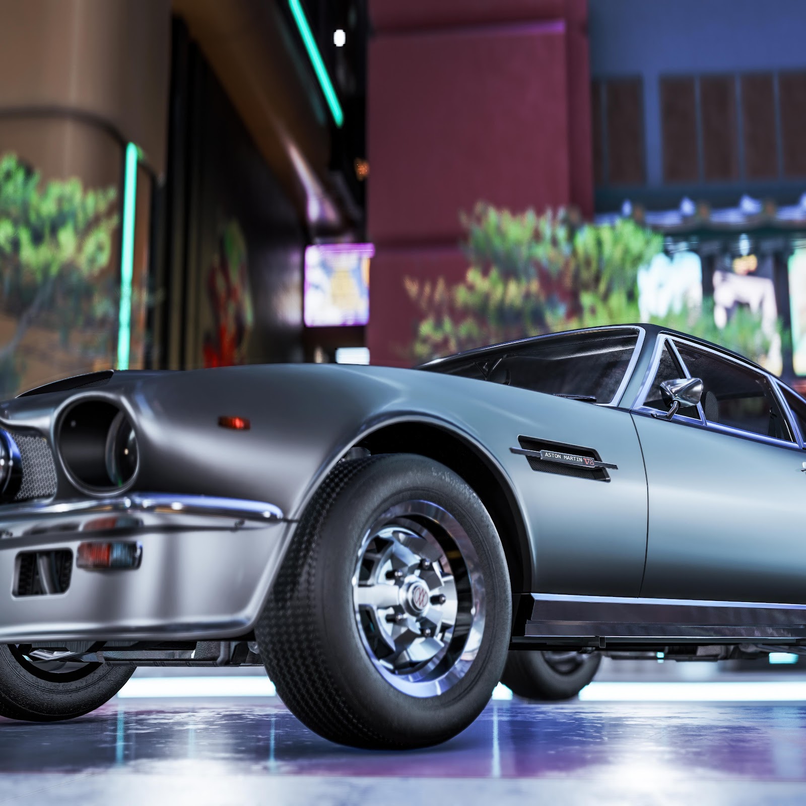 Aston Martin, Classic Car, Cyberpunk, Automotive Photography 8K Desktop and Mobile Wallpaper Background with a maximum resolution of 7680x4320 px.