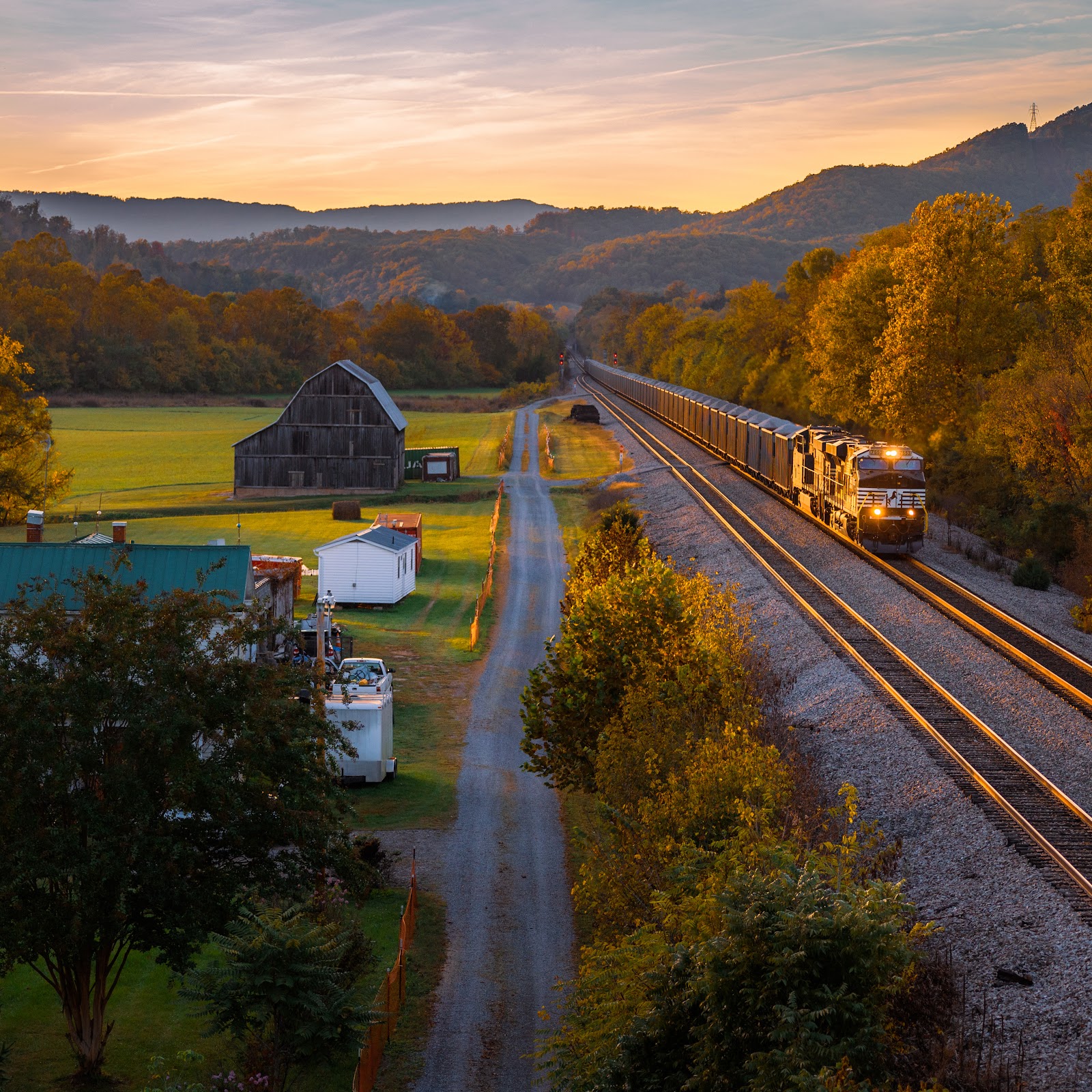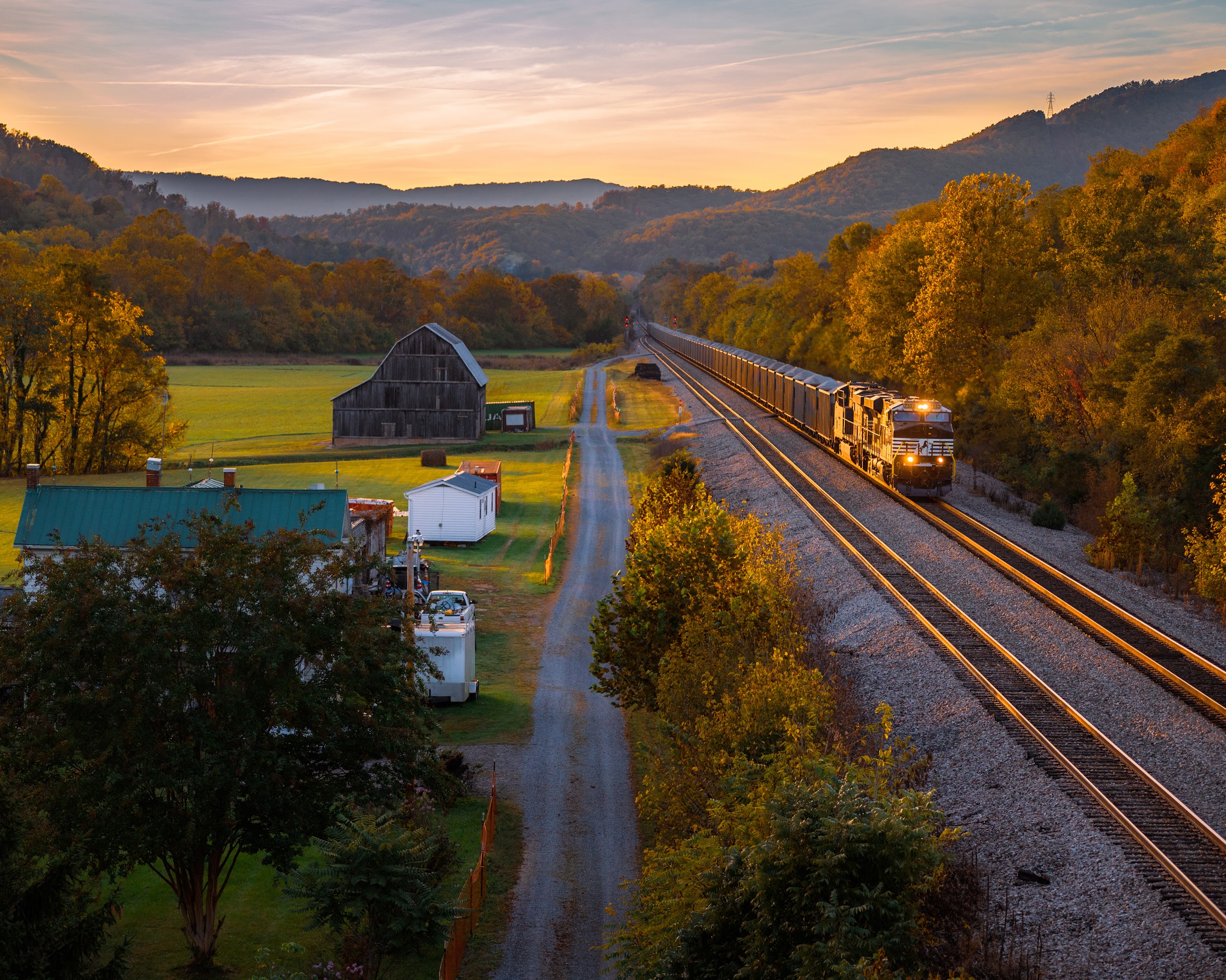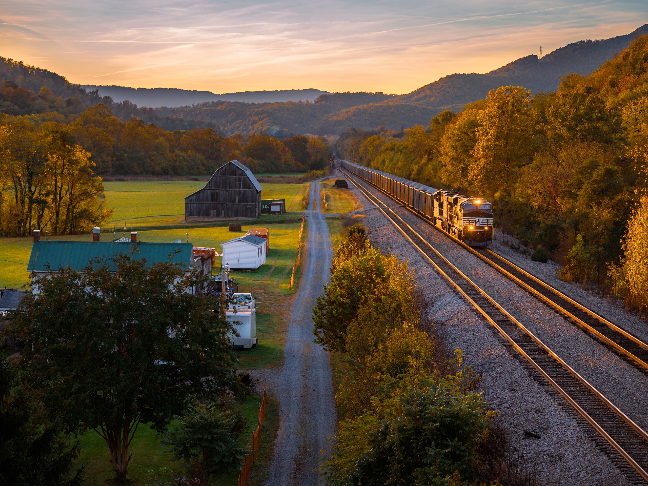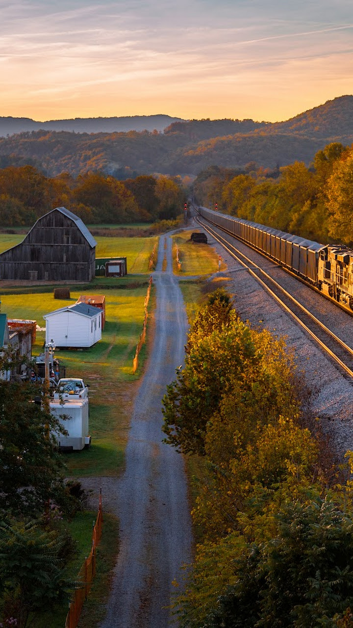 Autumn Landscape, Train, Rural Scene, Railroad Tracks 5K Desktop and Mobile Wallpaper Background with a maximum resolution of 5987x3689 px.