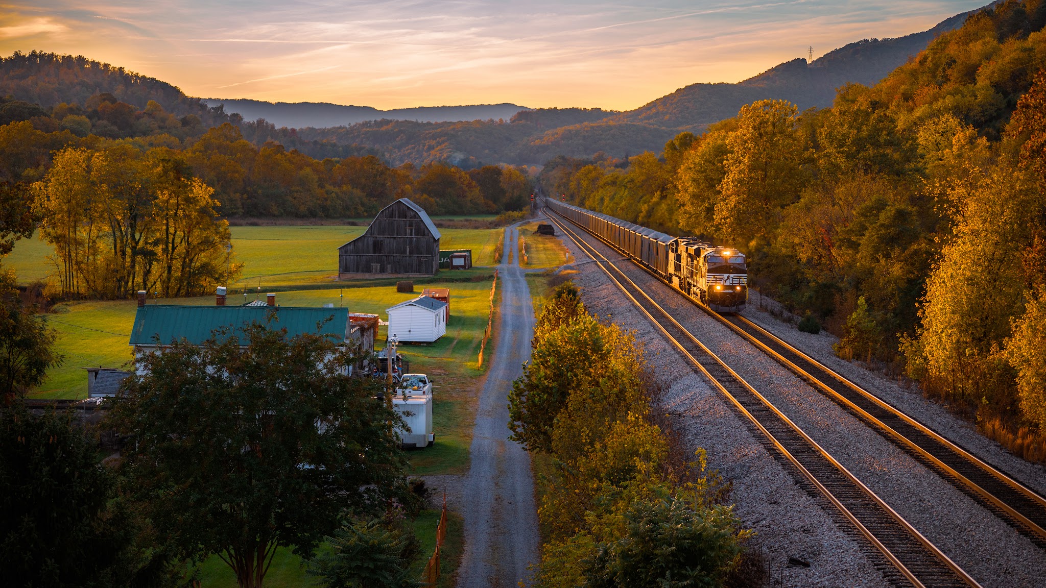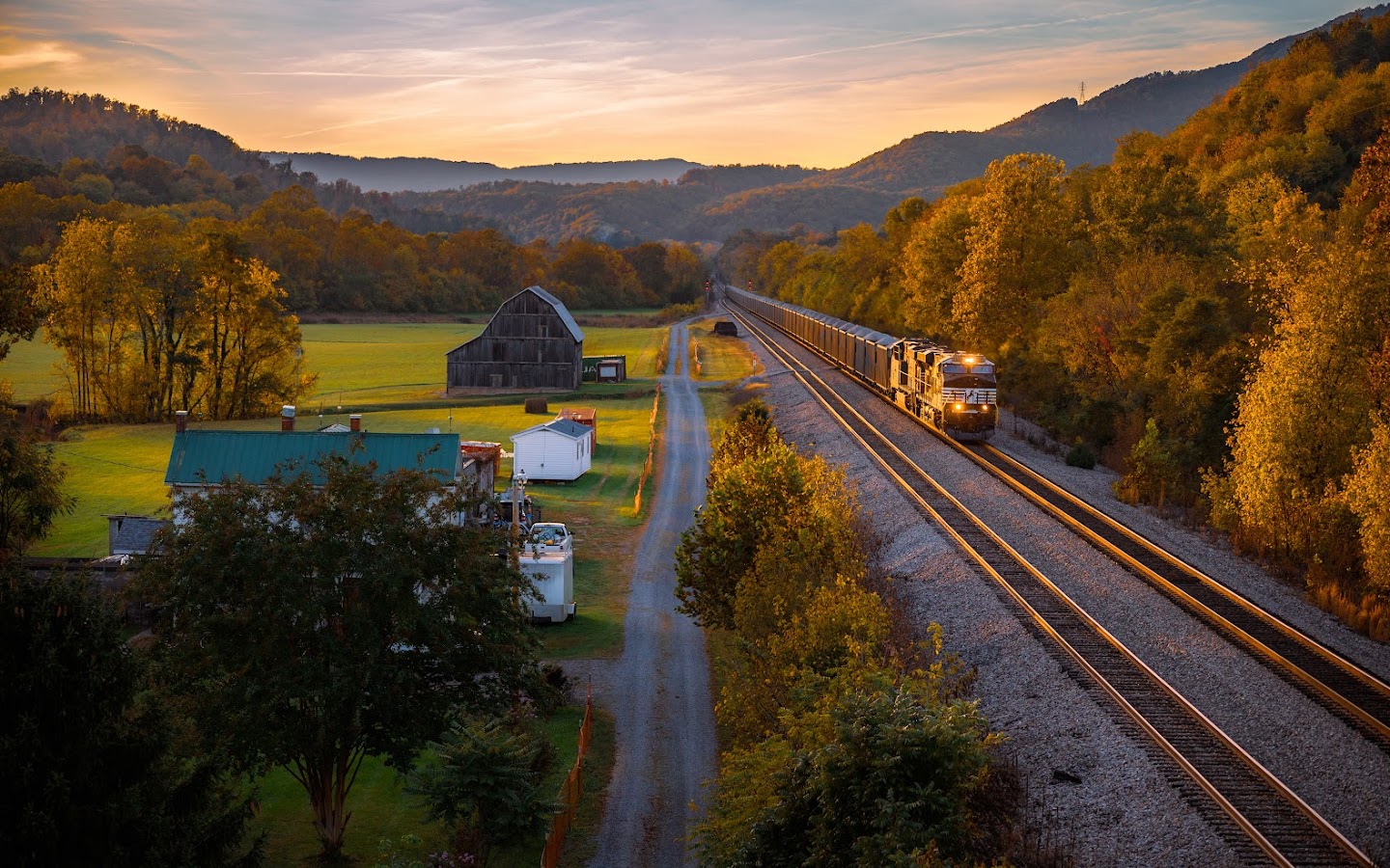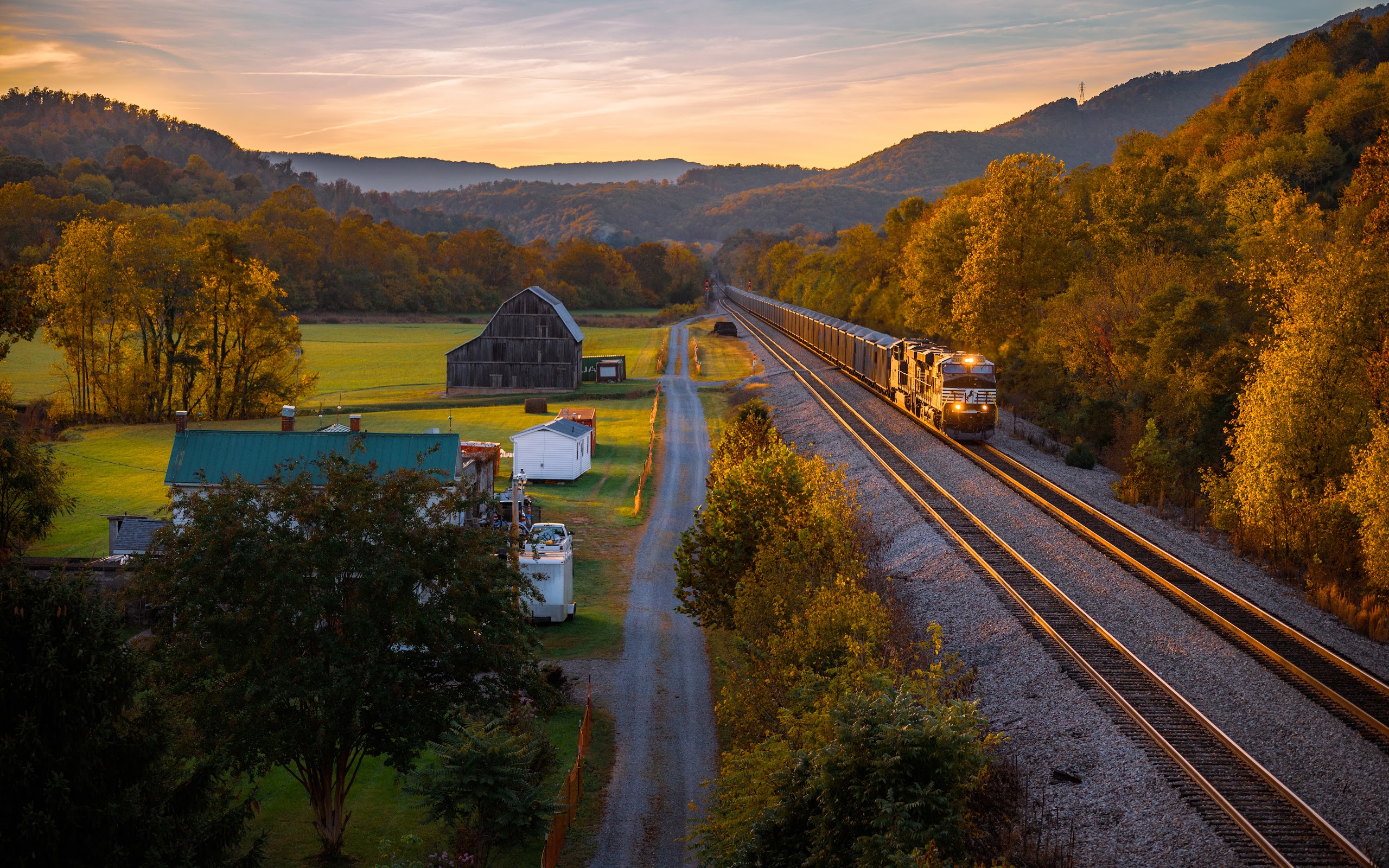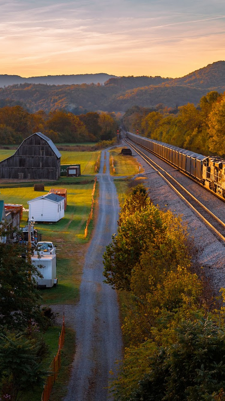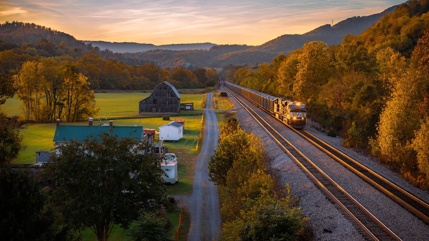 Autumn Landscape, Train, Rural Scene, Railroad Tracks 5K Desktop Wallpaper
