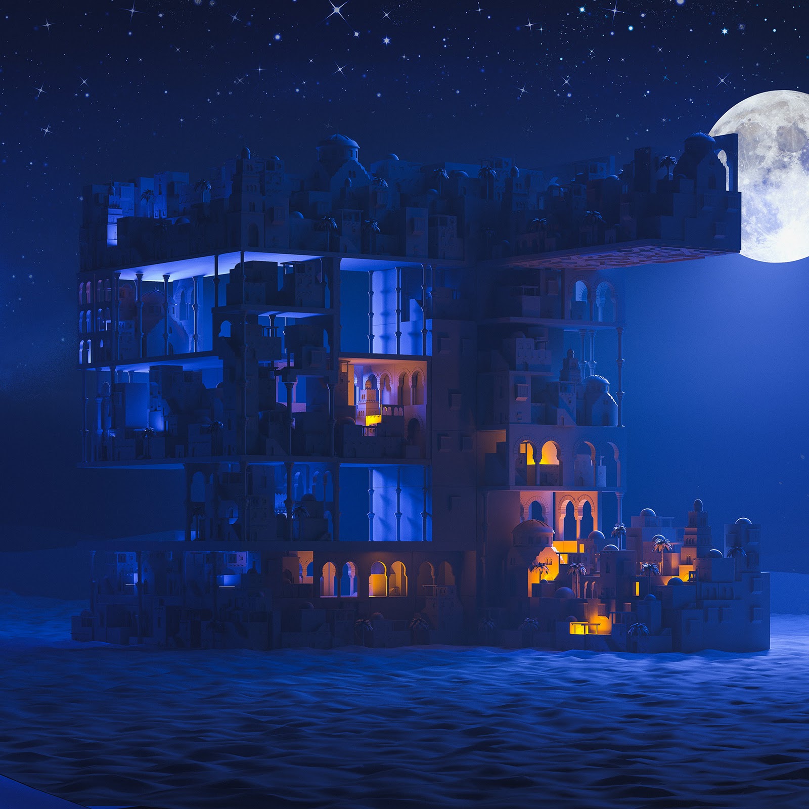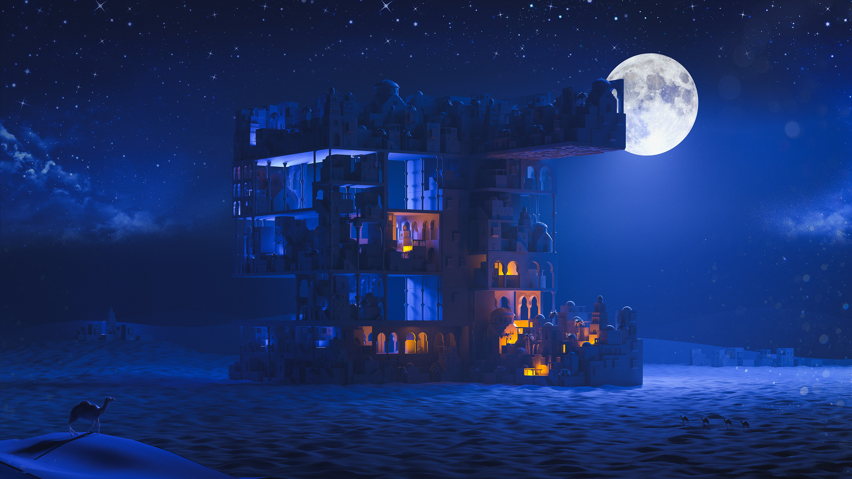 Desert Architecture, Surreal Landscape, Arabian Night, Full Moon 2K Desktop and Mobile Wallpaper Background with a maximum resolution of 2800x1576 px.