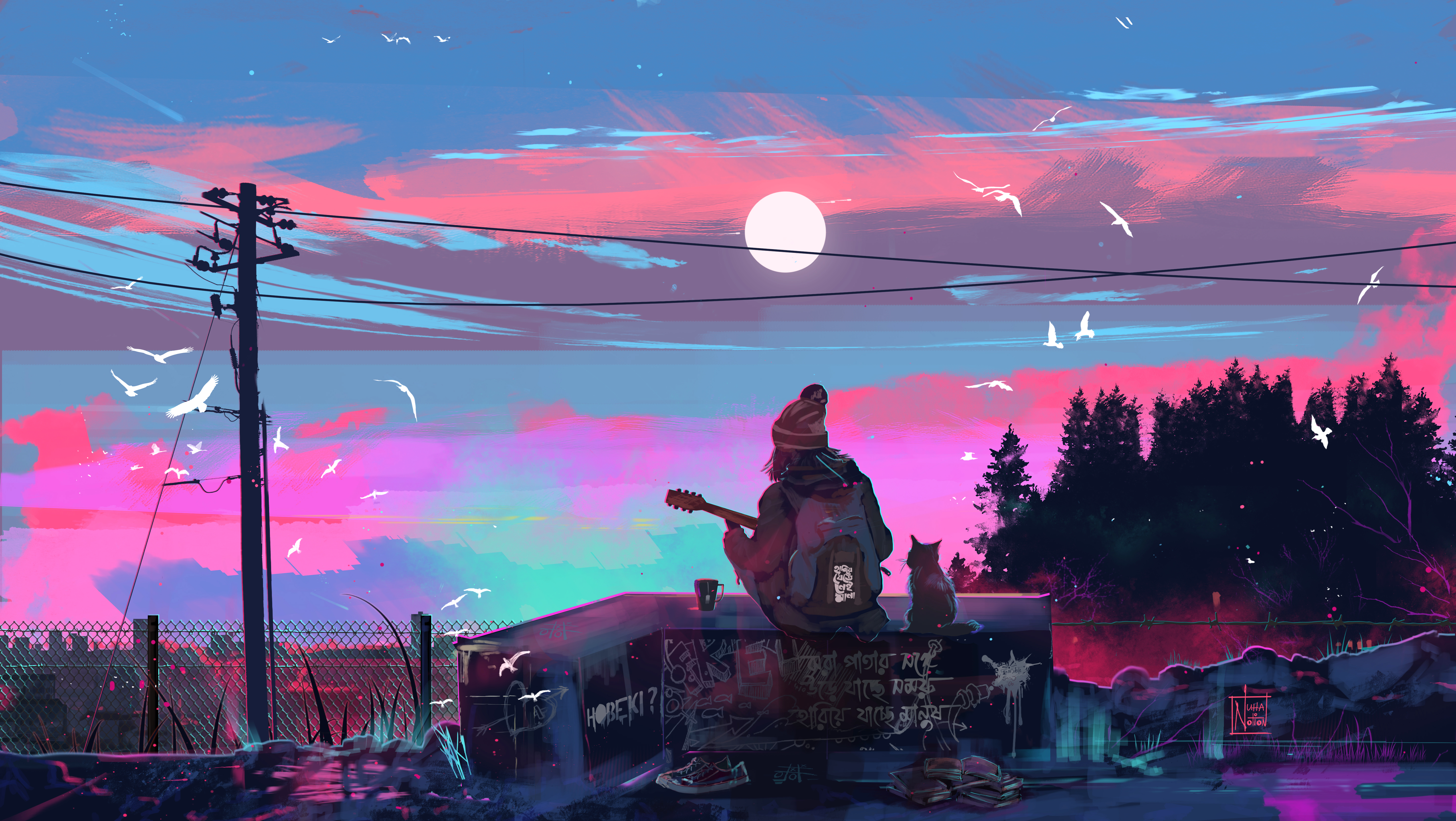 Digital Art, Sunset Scenery, Guitar Girl, Cityscape Illustration 5K Desktop and Mobile Wallpaper Background with a maximum resolution of 5760x3249 px.