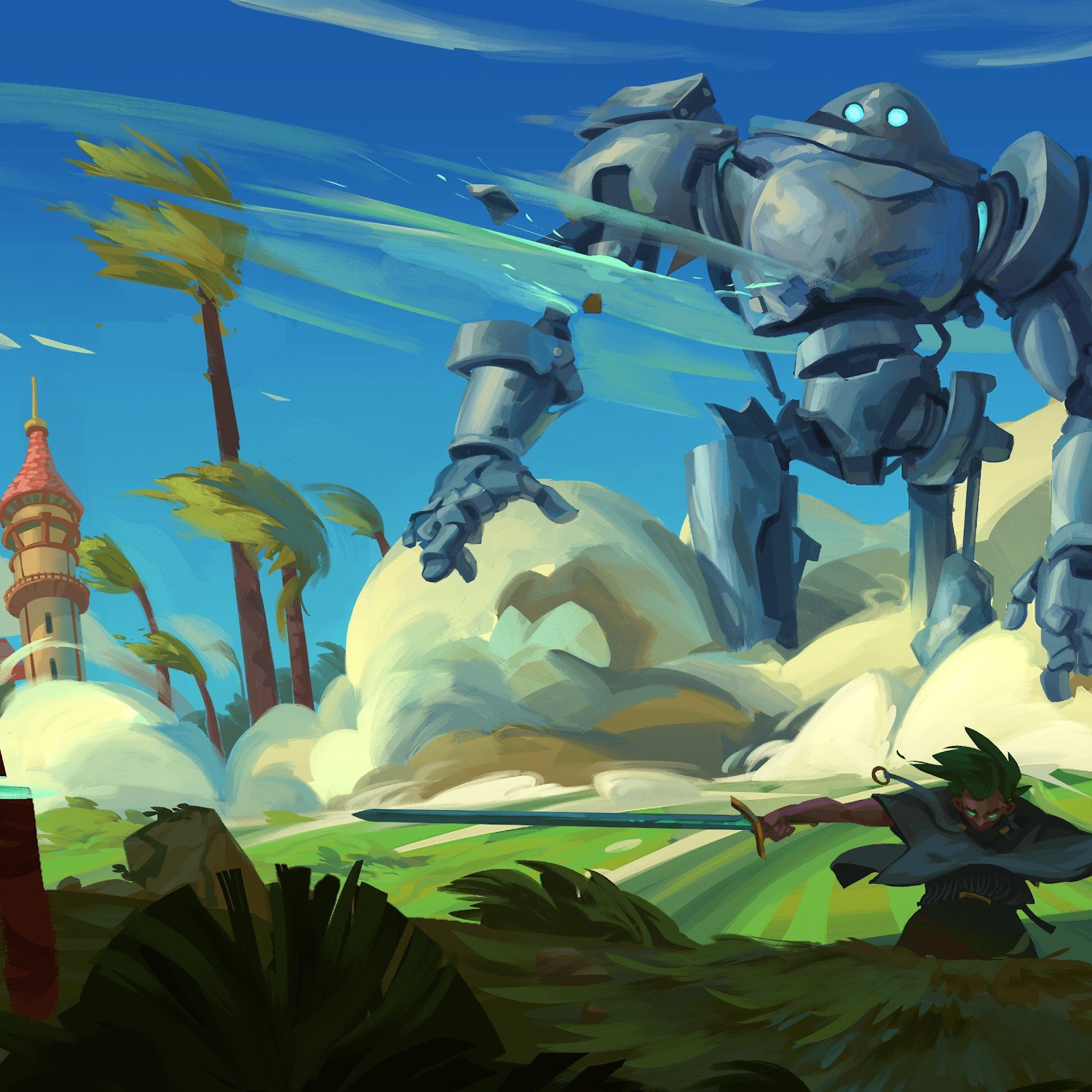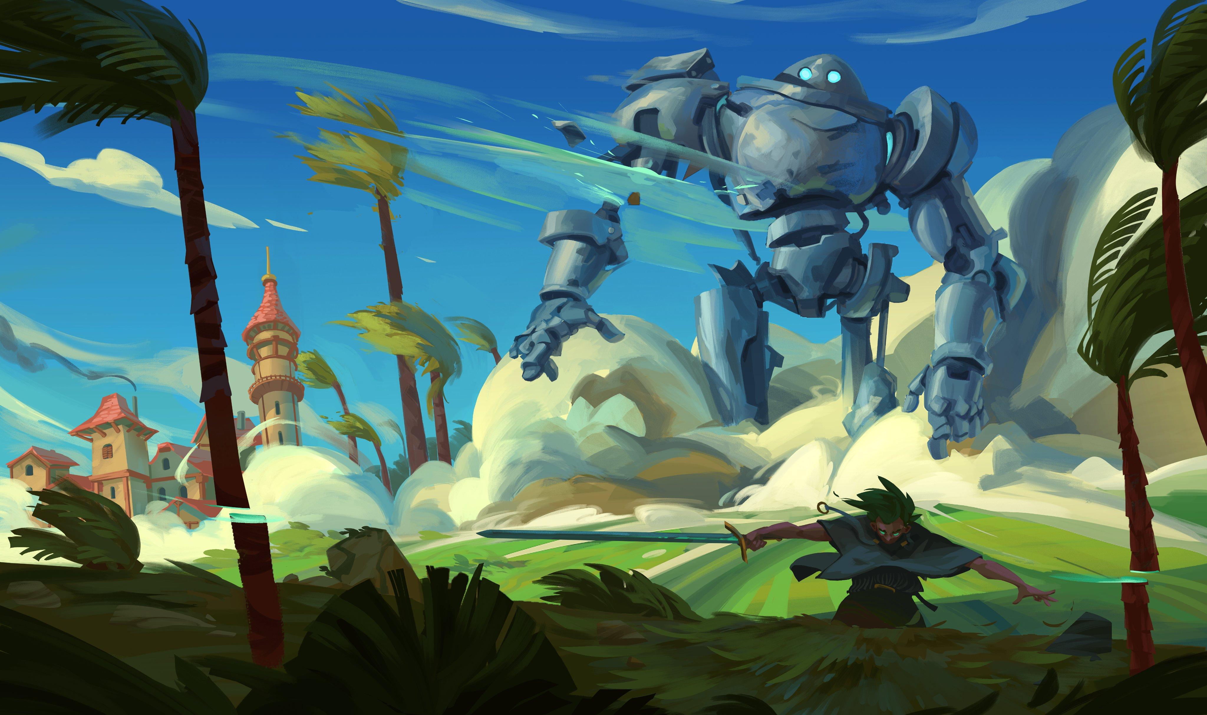 Fantasy Art, Robot, Palm Trees, Swordsman 4K Desktop and Mobile Wallpaper Background with a maximum resolution of 4096x2429 px.