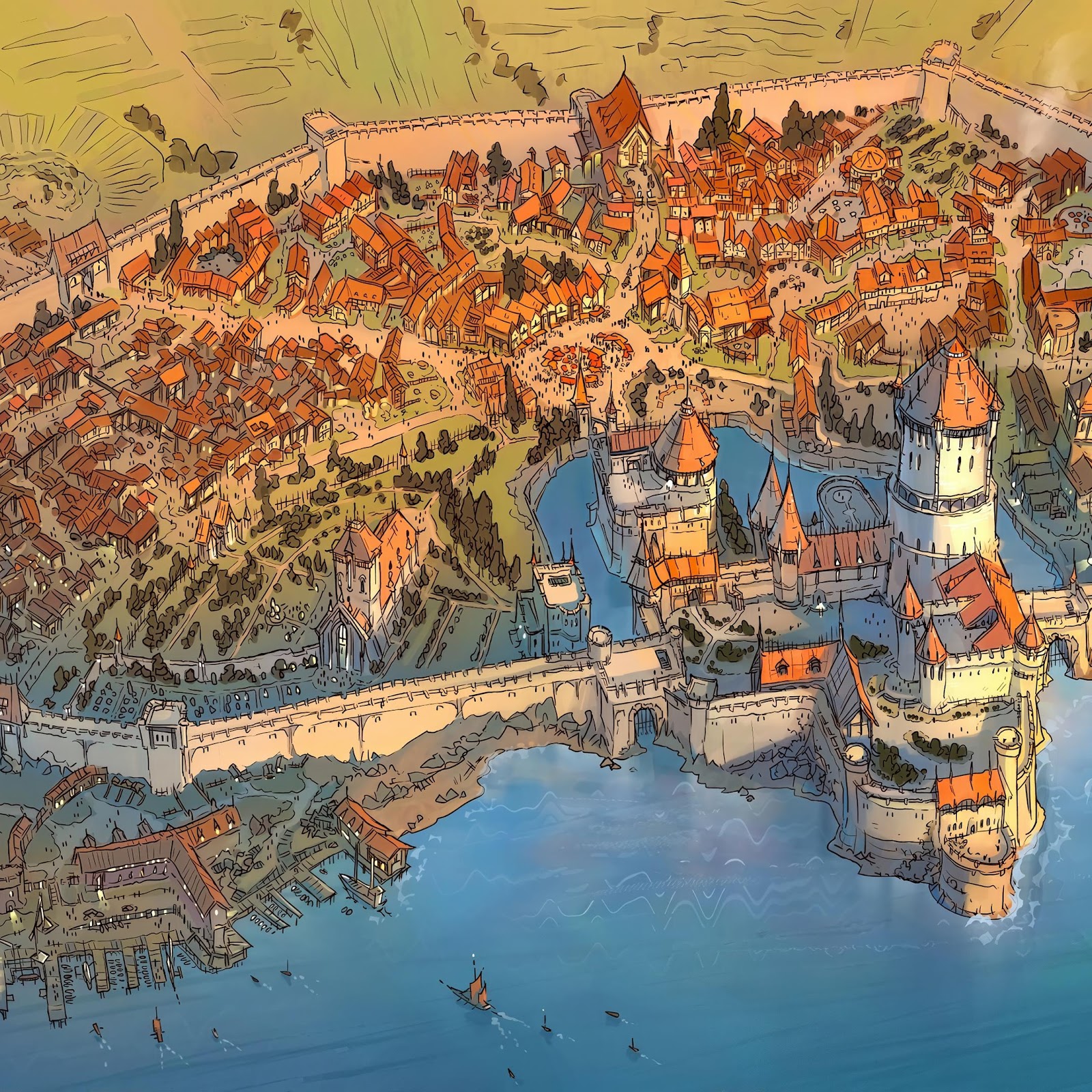 Fantasy City, Medieval, Illustration, Townscape 4K Desktop and Mobile Wallpaper Background with a maximum resolution of 3840x2160 px.