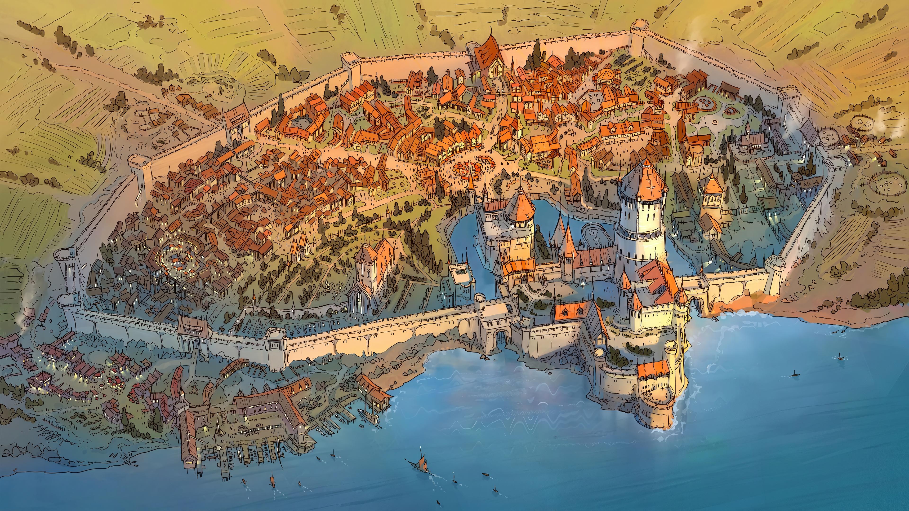 Fantasy City, Medieval, Illustration, Townscape 4K Desktop Wallpaper