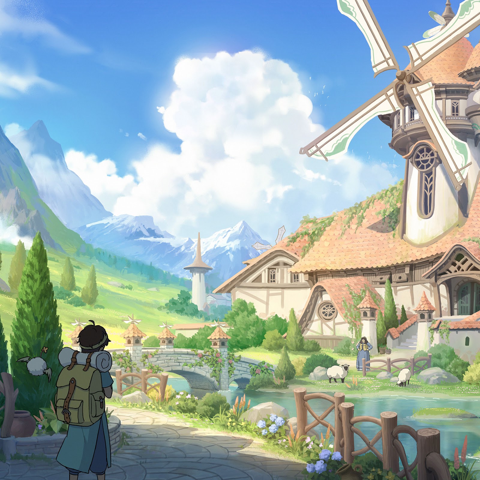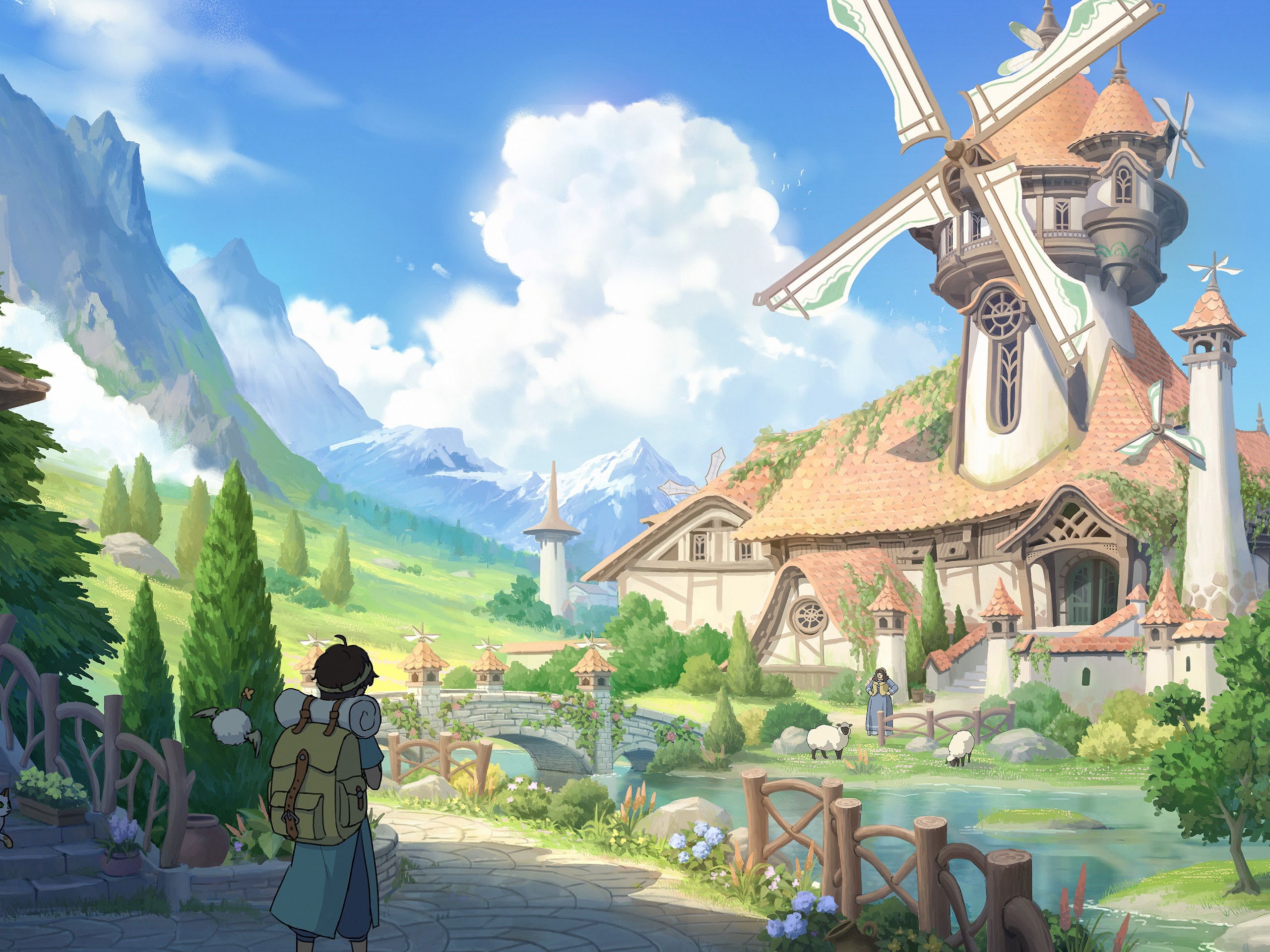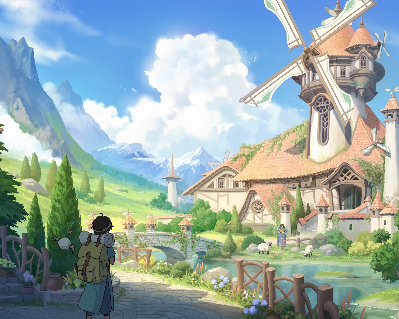 Fantasy Landscape, Anime Scenery, Windmill, Village Art 4K Ultrawide Desktop Wallpaper