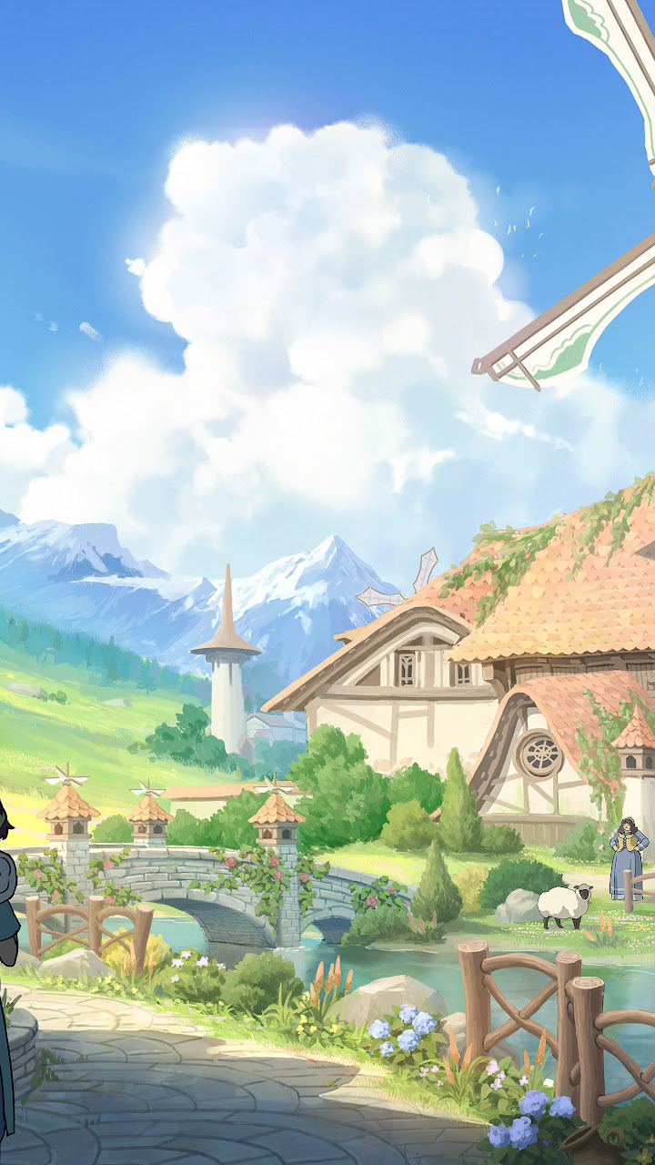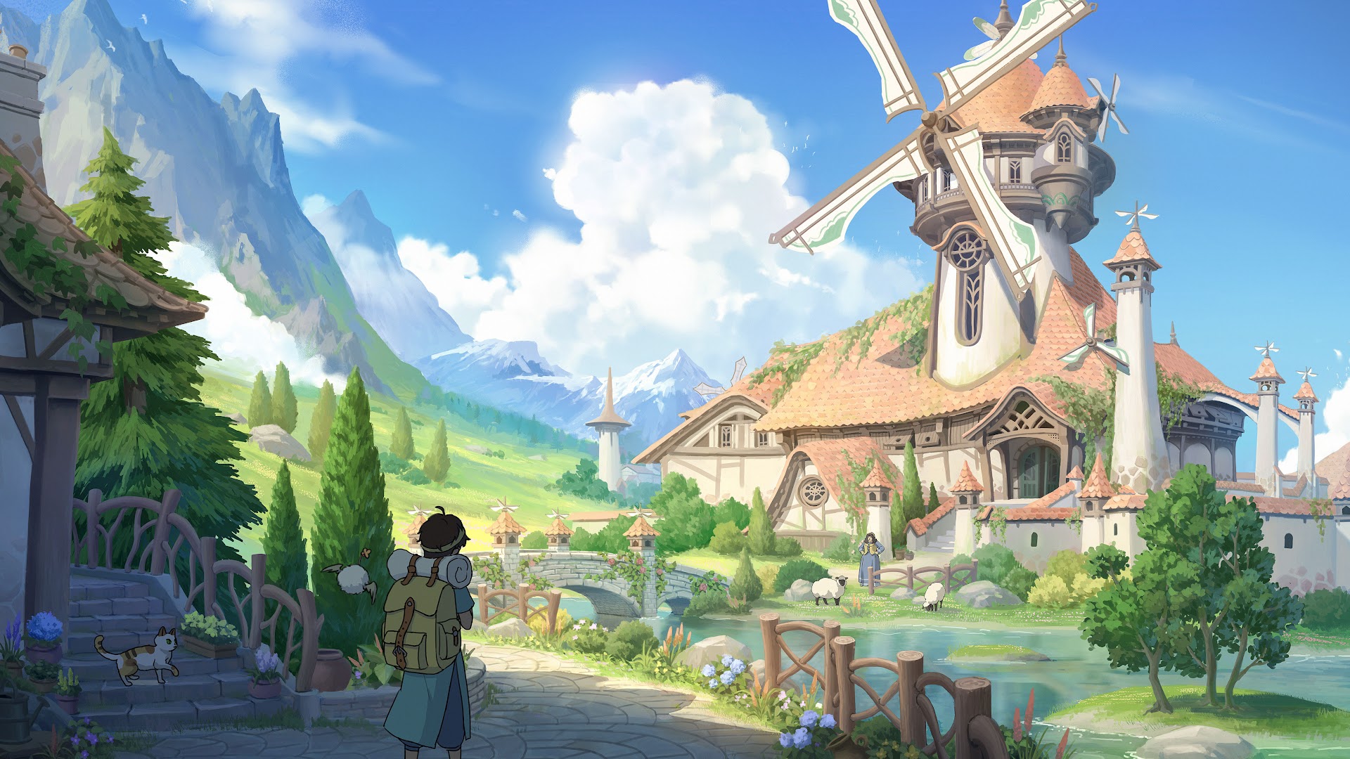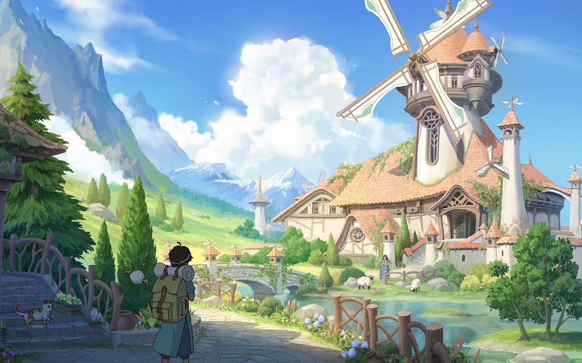 Fantasy Landscape, Anime Scenery, Windmill, Village Art 4K Ultrawide Desktop Wallpaper