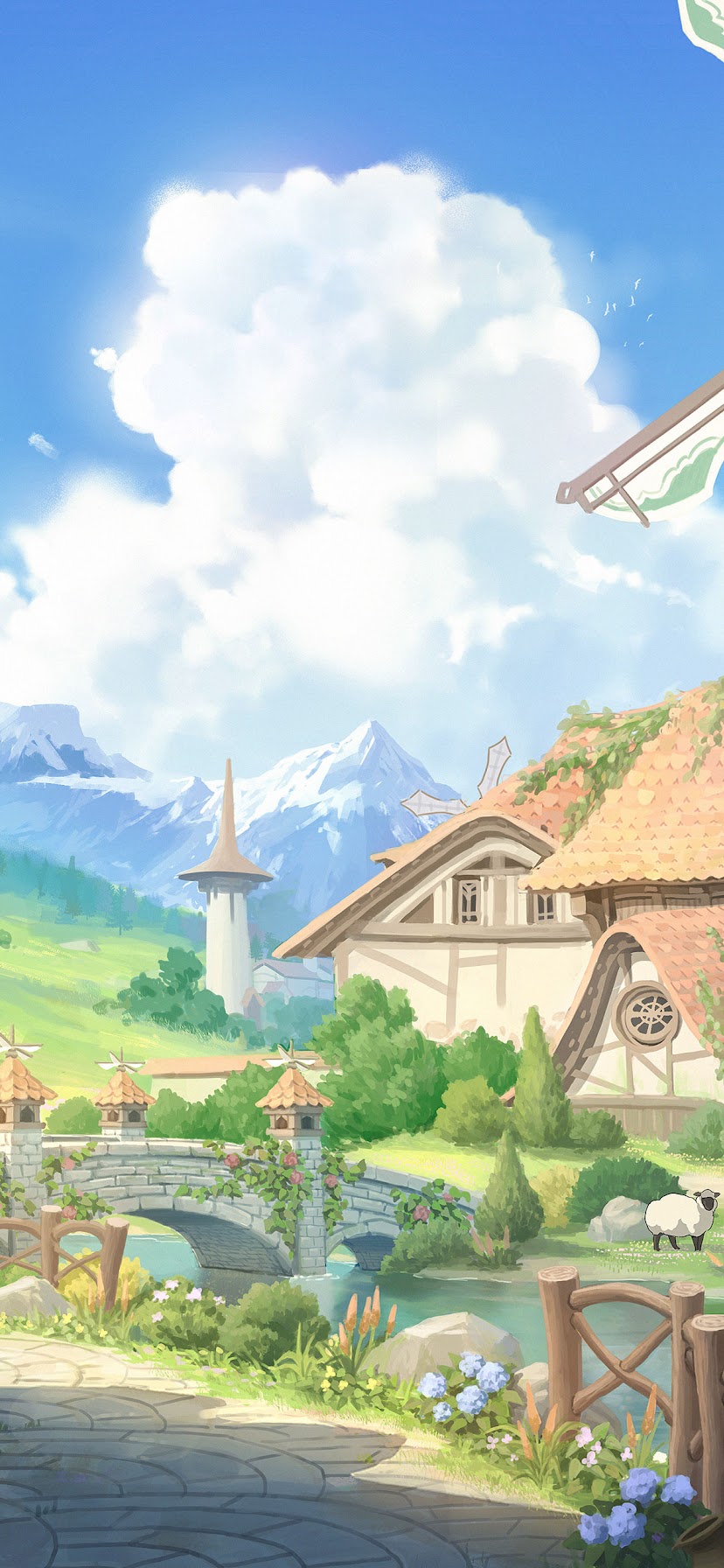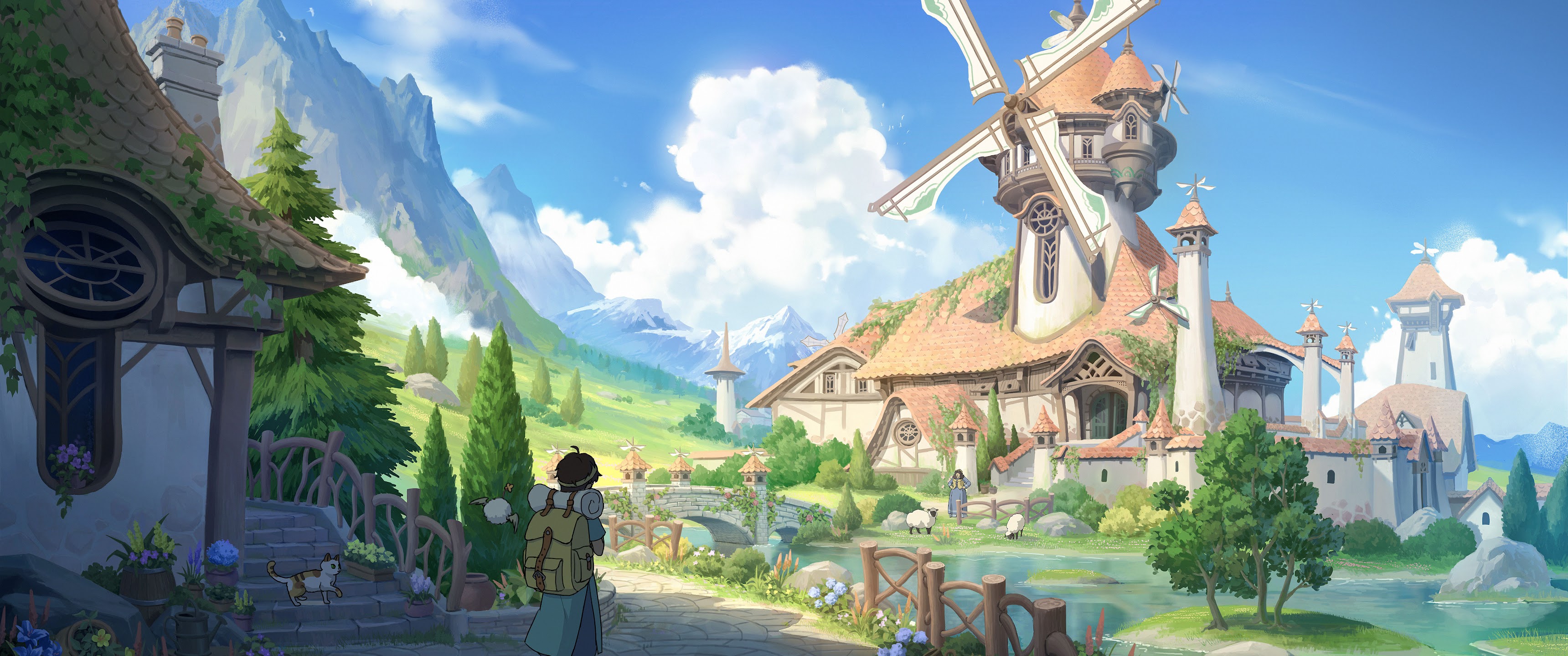 Fantasy Landscape, Anime Scenery, Windmill, Village Art 4K Ultrawide Desktop and Mobile Wallpaper Background with a maximum resolution of 6000x2589 px.