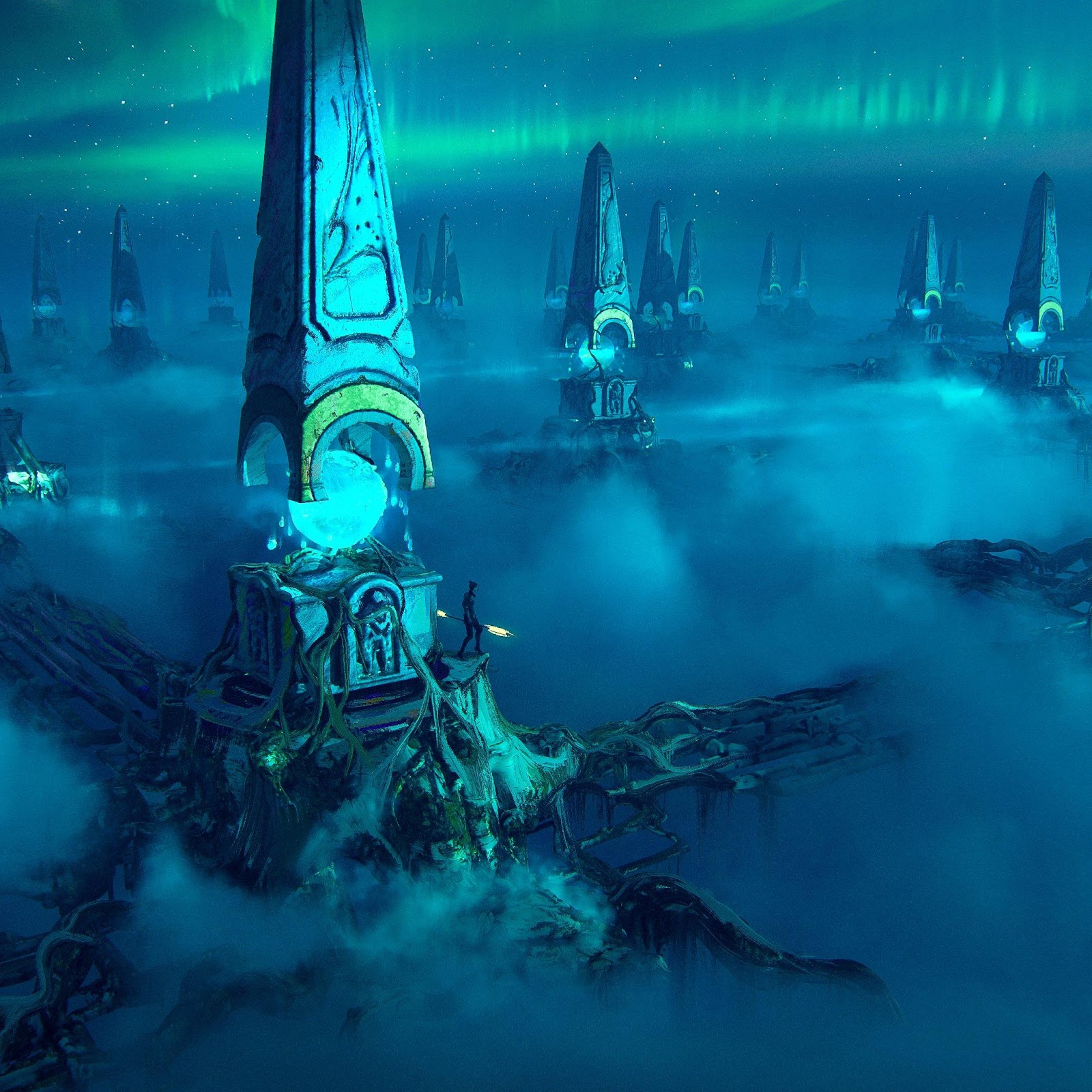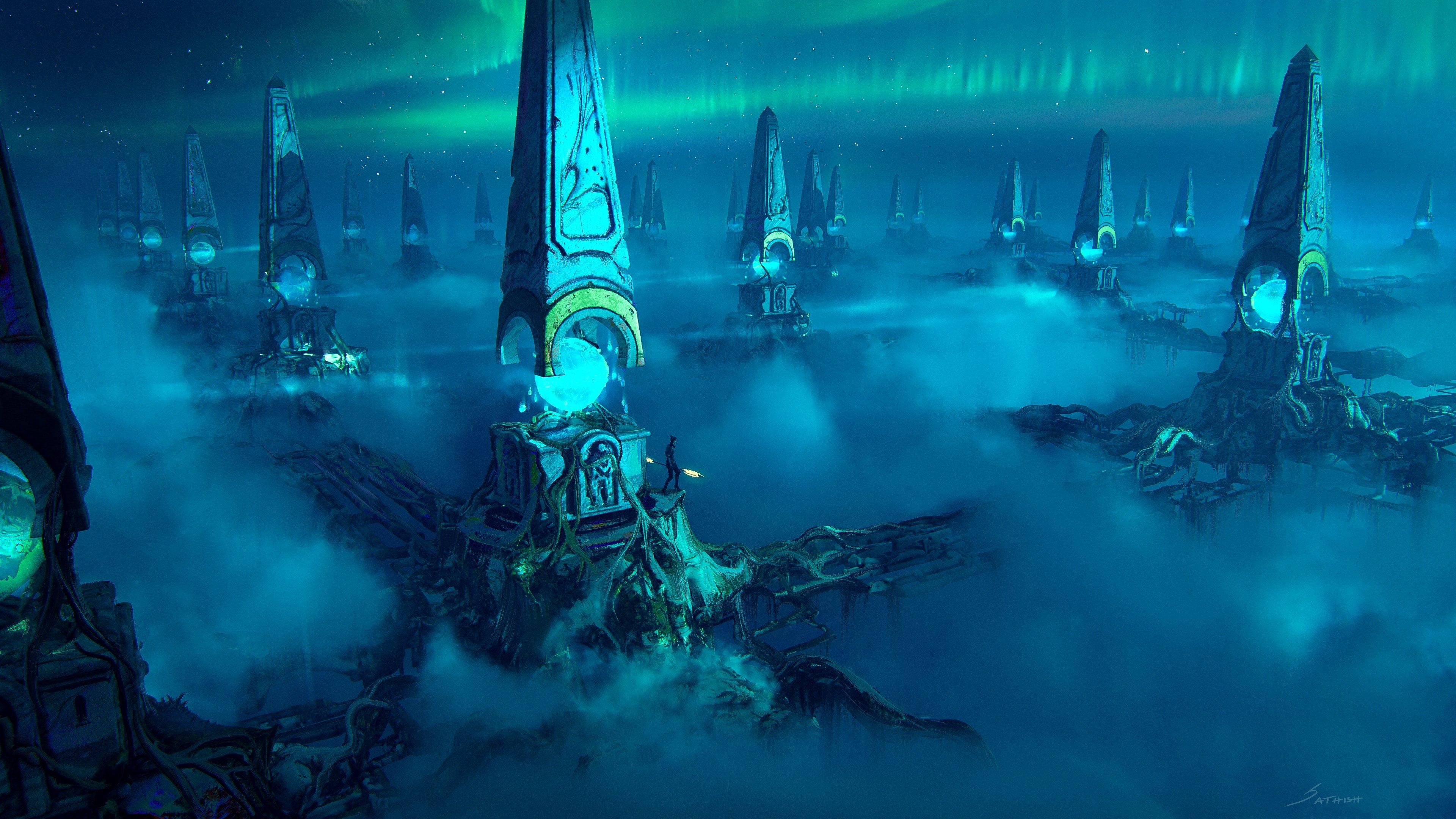 Fantasy Landscape, Aurora Borealis, Sci-Fi, Futuristic Cityscape 4K Desktop Wallpaper