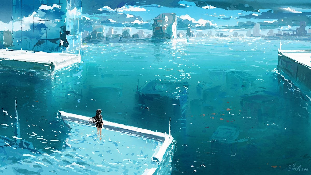 Flooded City, Digital Painting, Urban Fantasy, Dystopian Artwork 5K Wallpaper Background (6401x3618)