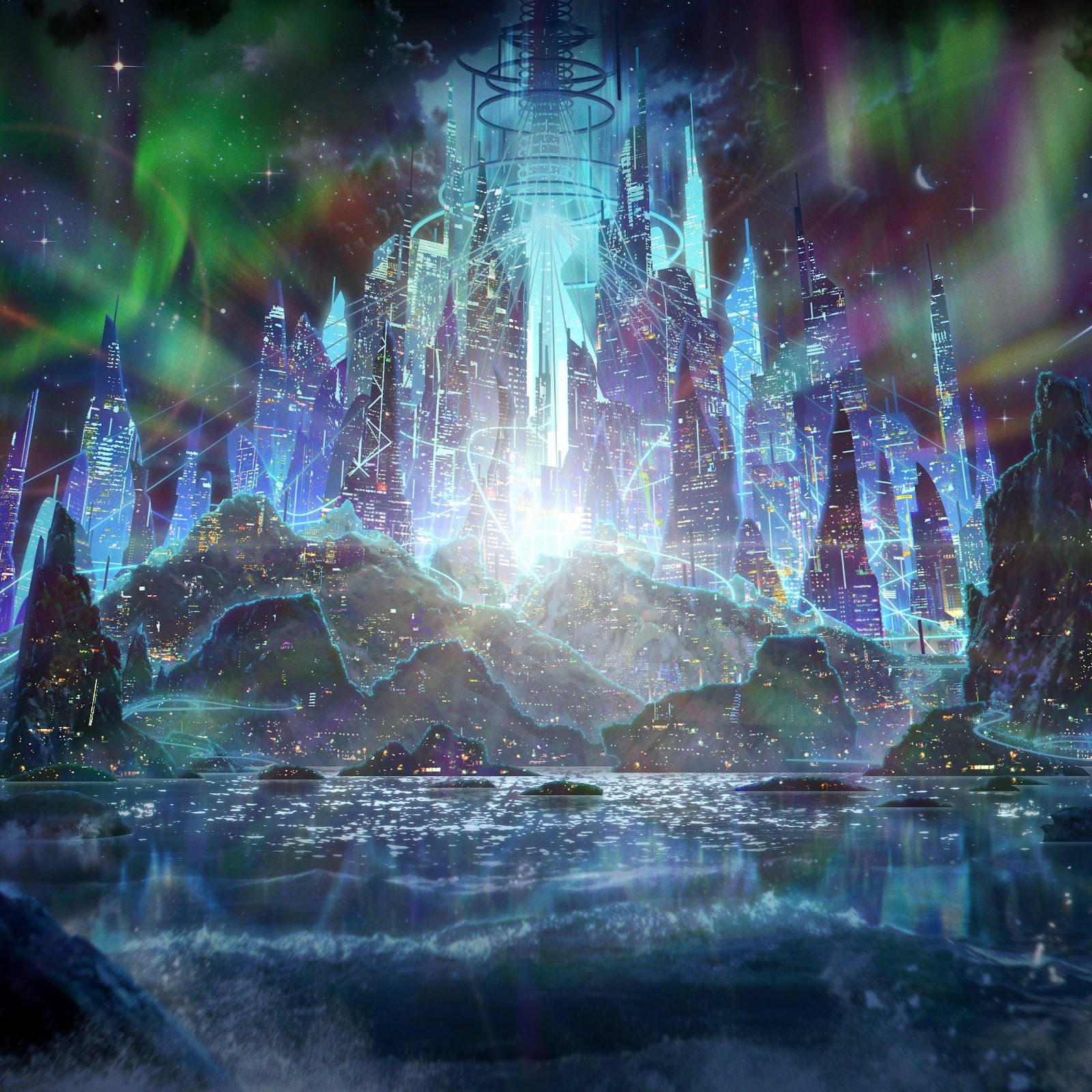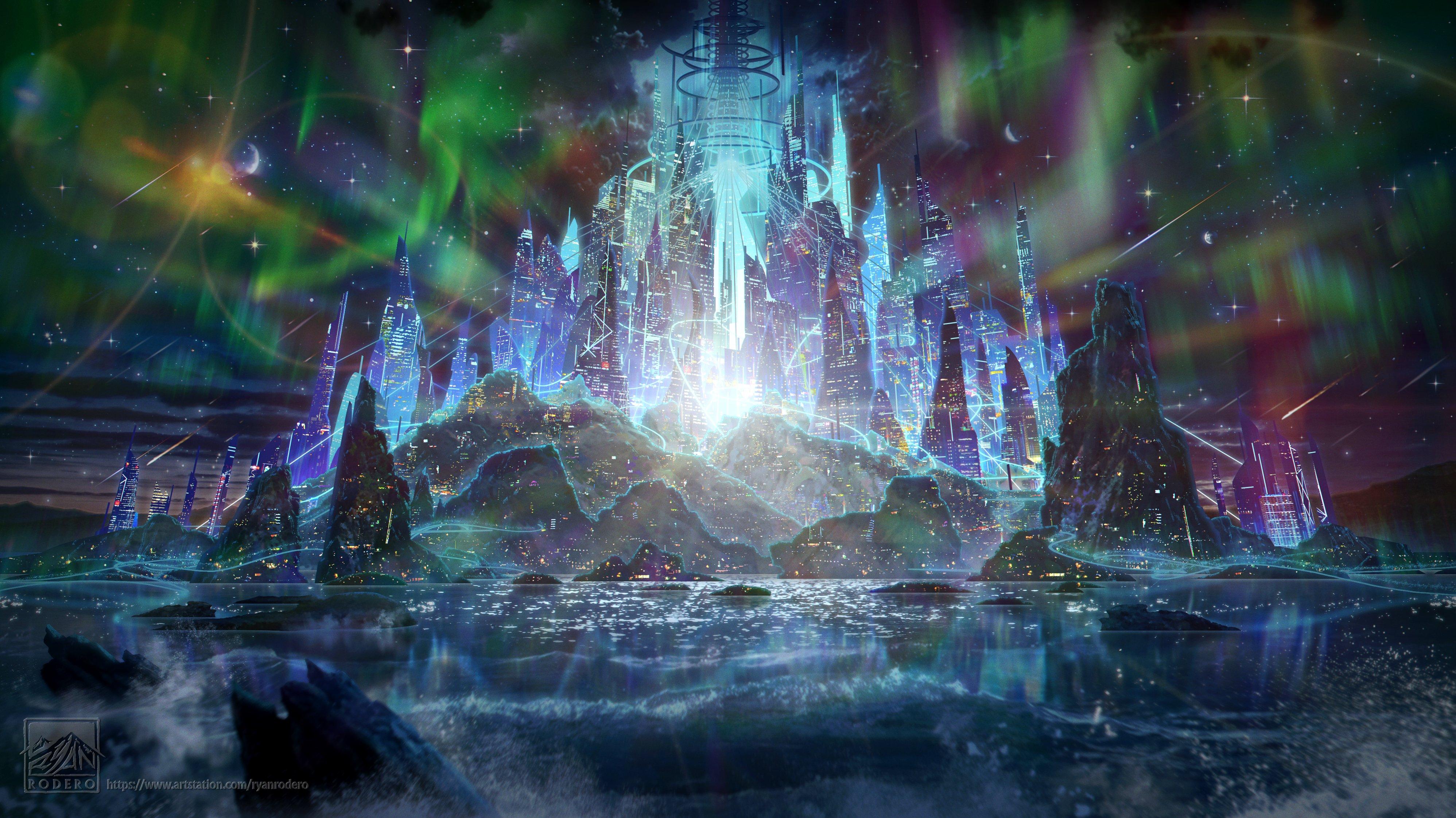 Futuristic City, Aurora Borealis, Sci-Fi, Digital Art 4K Desktop Wallpaper