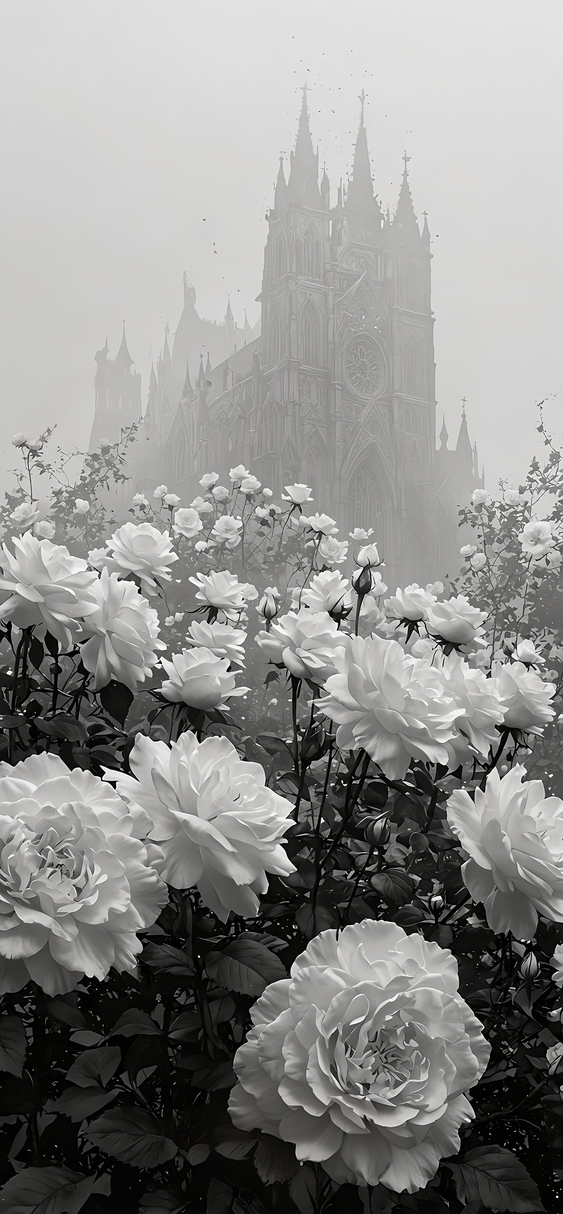 Gothic Architecture, White Roses, Foggy Landscape, Black And White Photography 2K iPhone Wallpaper Background with a maximum resolution of 1900x4096 px.