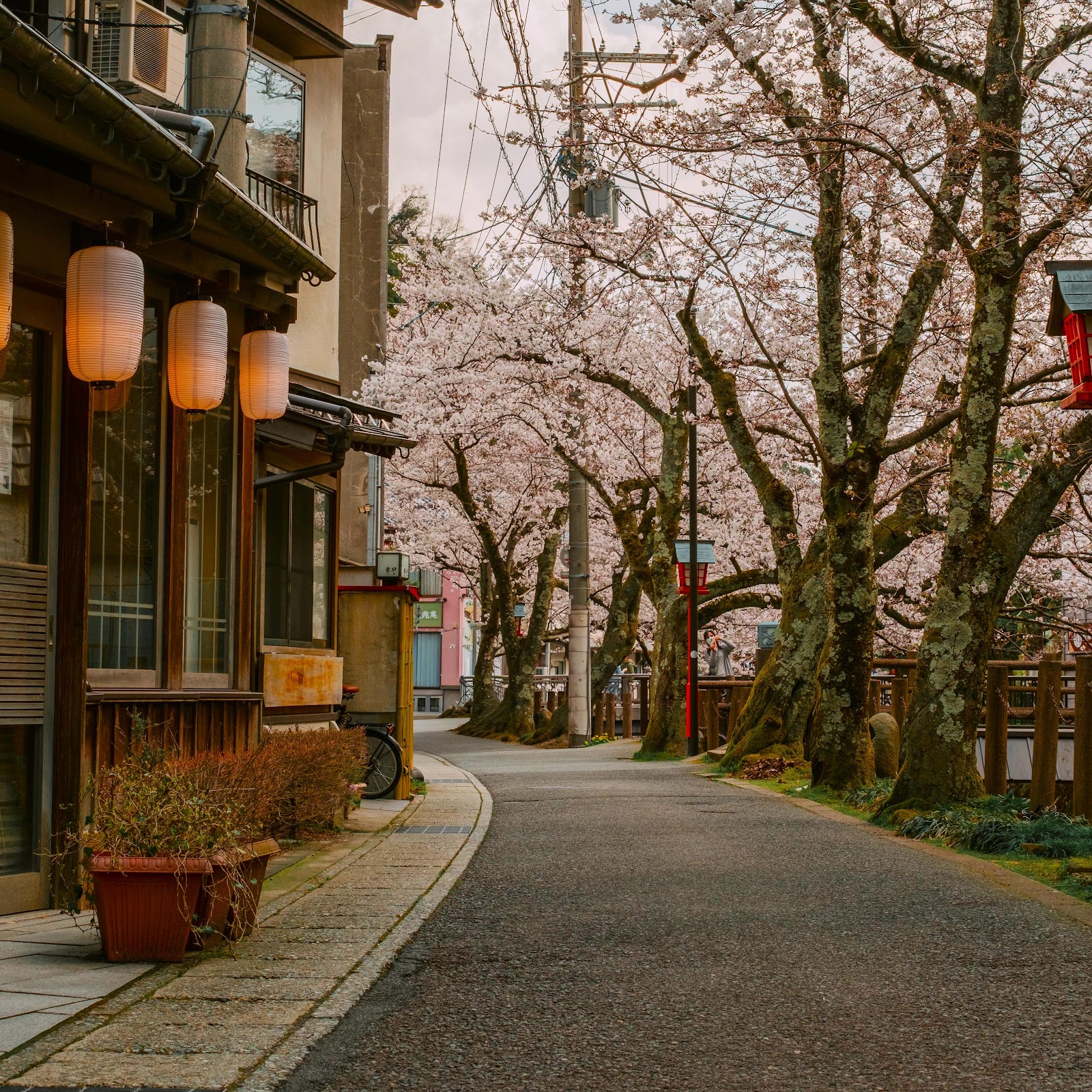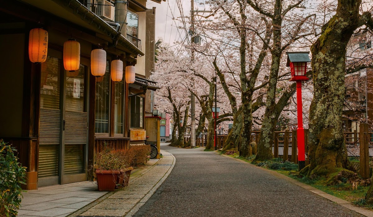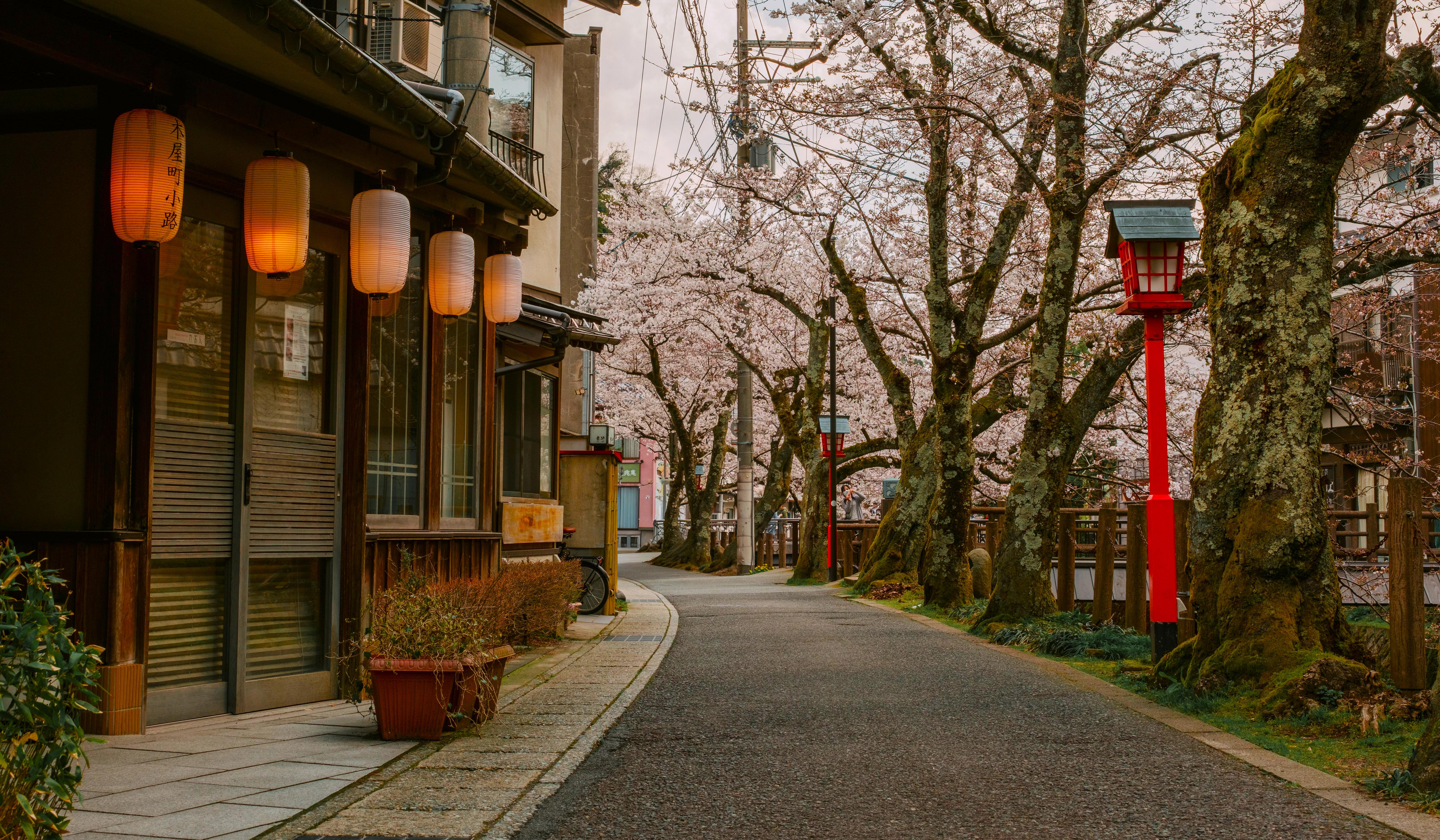 Japan, Cherry Blossoms, Street Photography, Lanterns 5K Desktop and Mobile Wallpaper Background with a maximum resolution of 6144x3587 px.