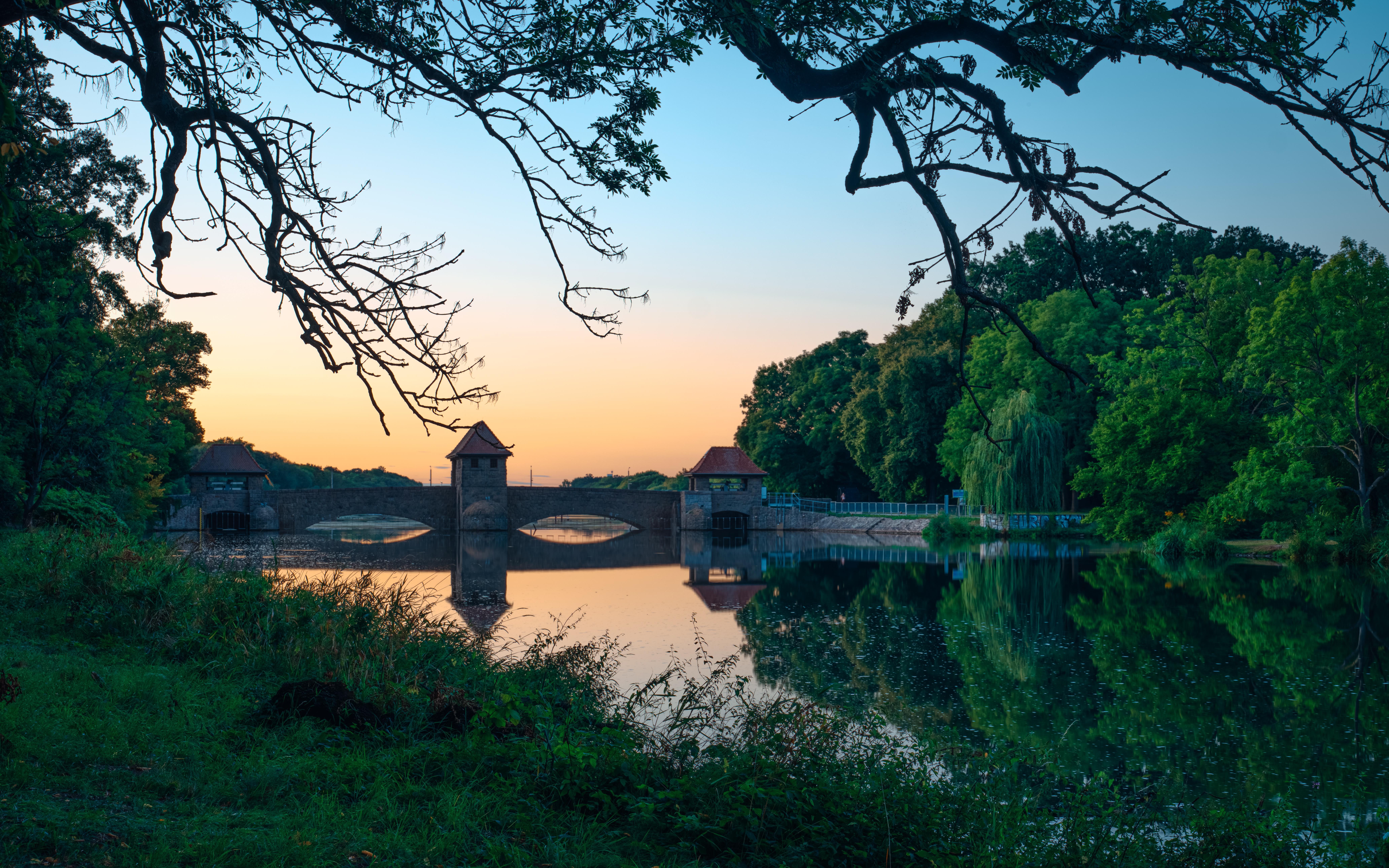 Lake Landscape, Dam Architecture, Calm Water, Sunrise Scenery 8K Desktop and Mobile Wallpaper Background with a maximum resolution of 8254x5160 px.
