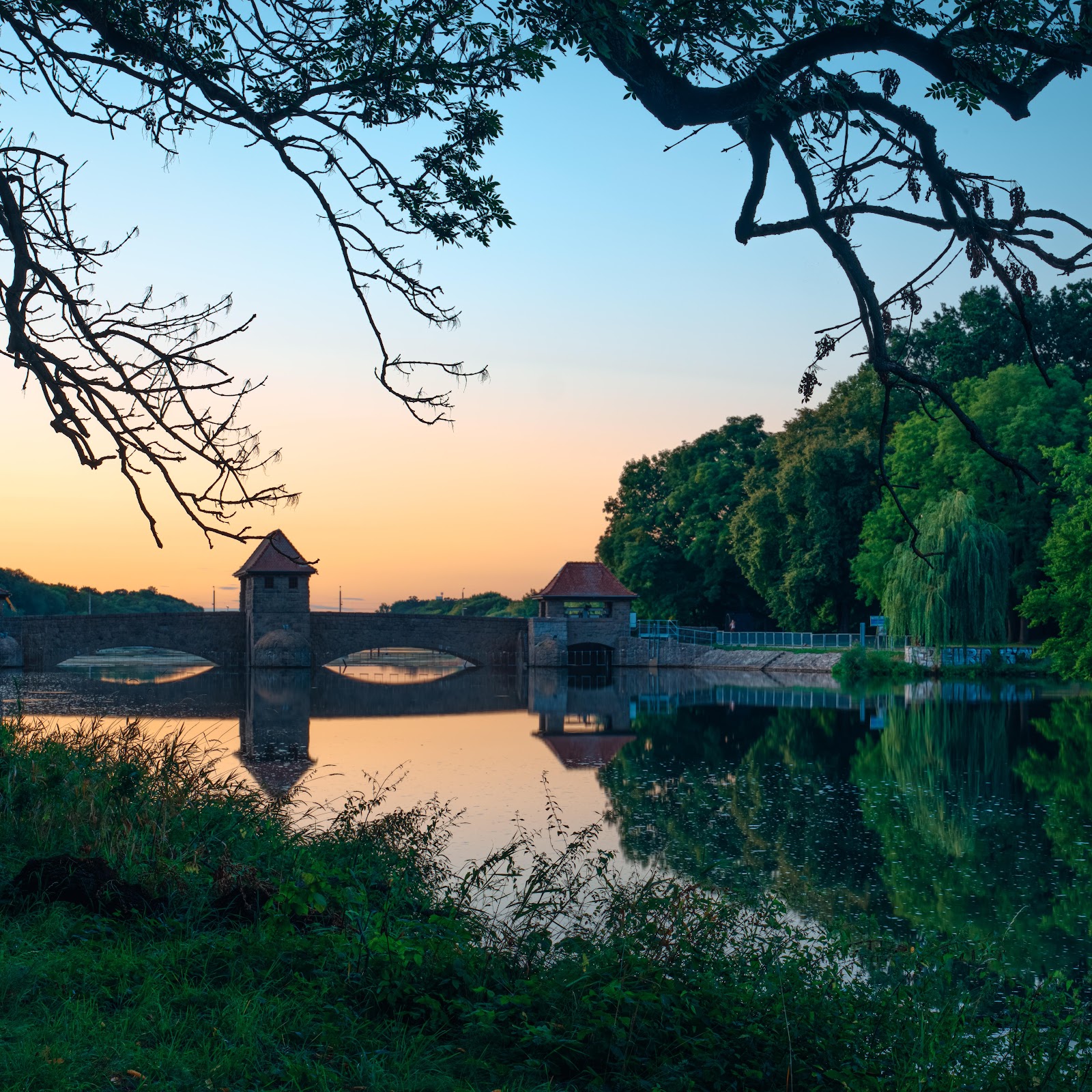Lake Landscape, Dam Architecture, Calm Water, Sunrise Scenery 8K Desktop and Mobile Wallpaper Background with a maximum resolution of 8254x5160 px.