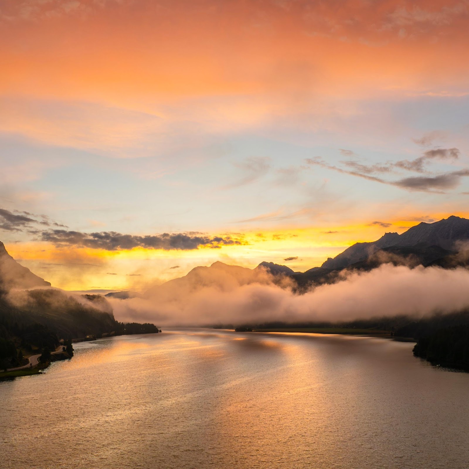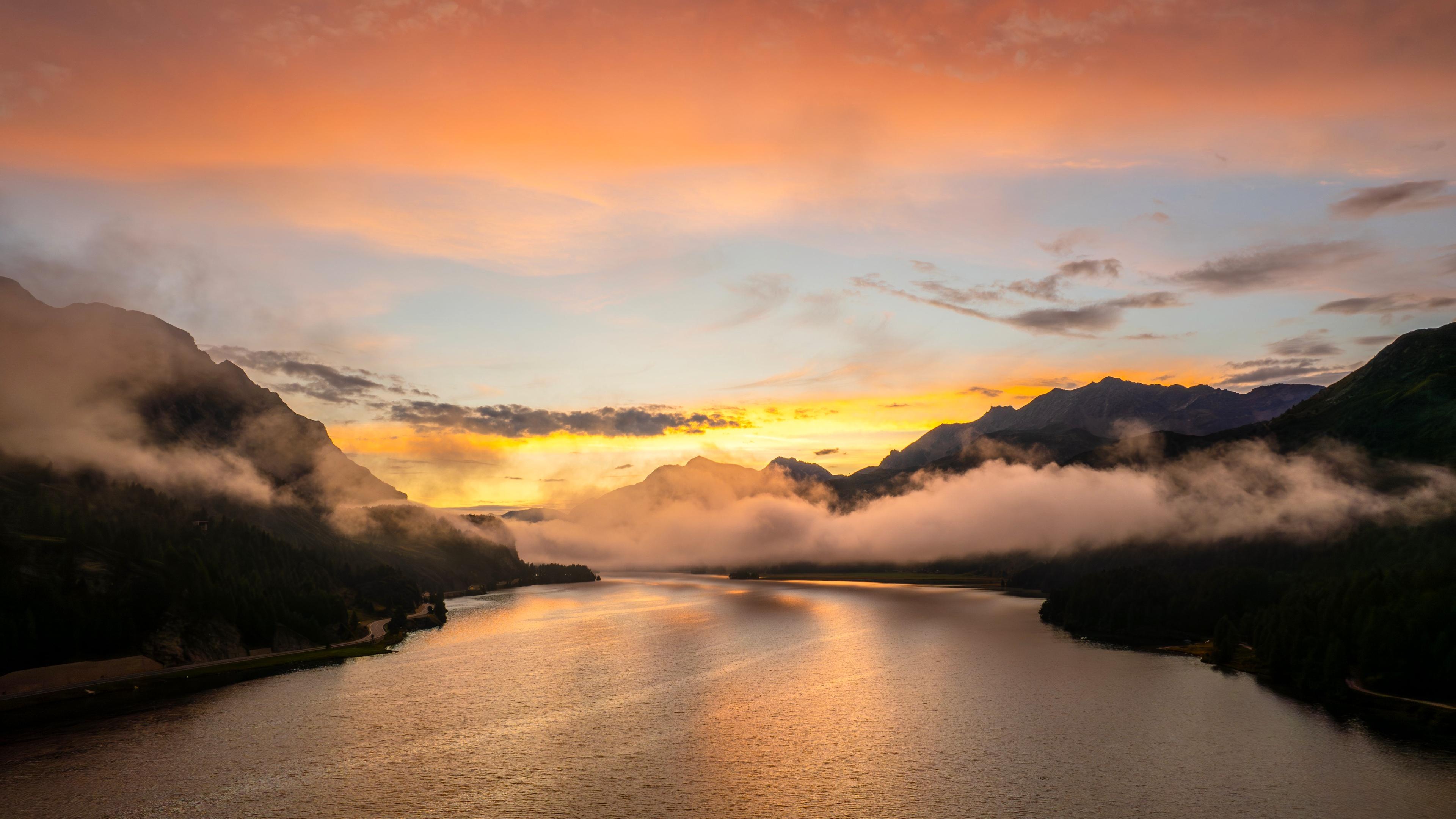 Mountain Lake, Sunset Landscape, Foggy Mountains, Nature Photography 4K Desktop and Mobile Wallpaper Background with a maximum resolution of 3840x2160 px.