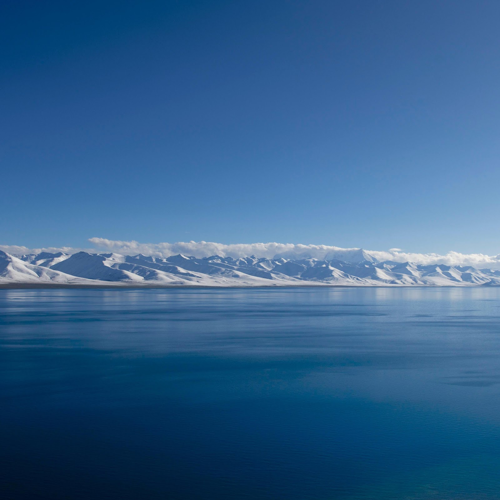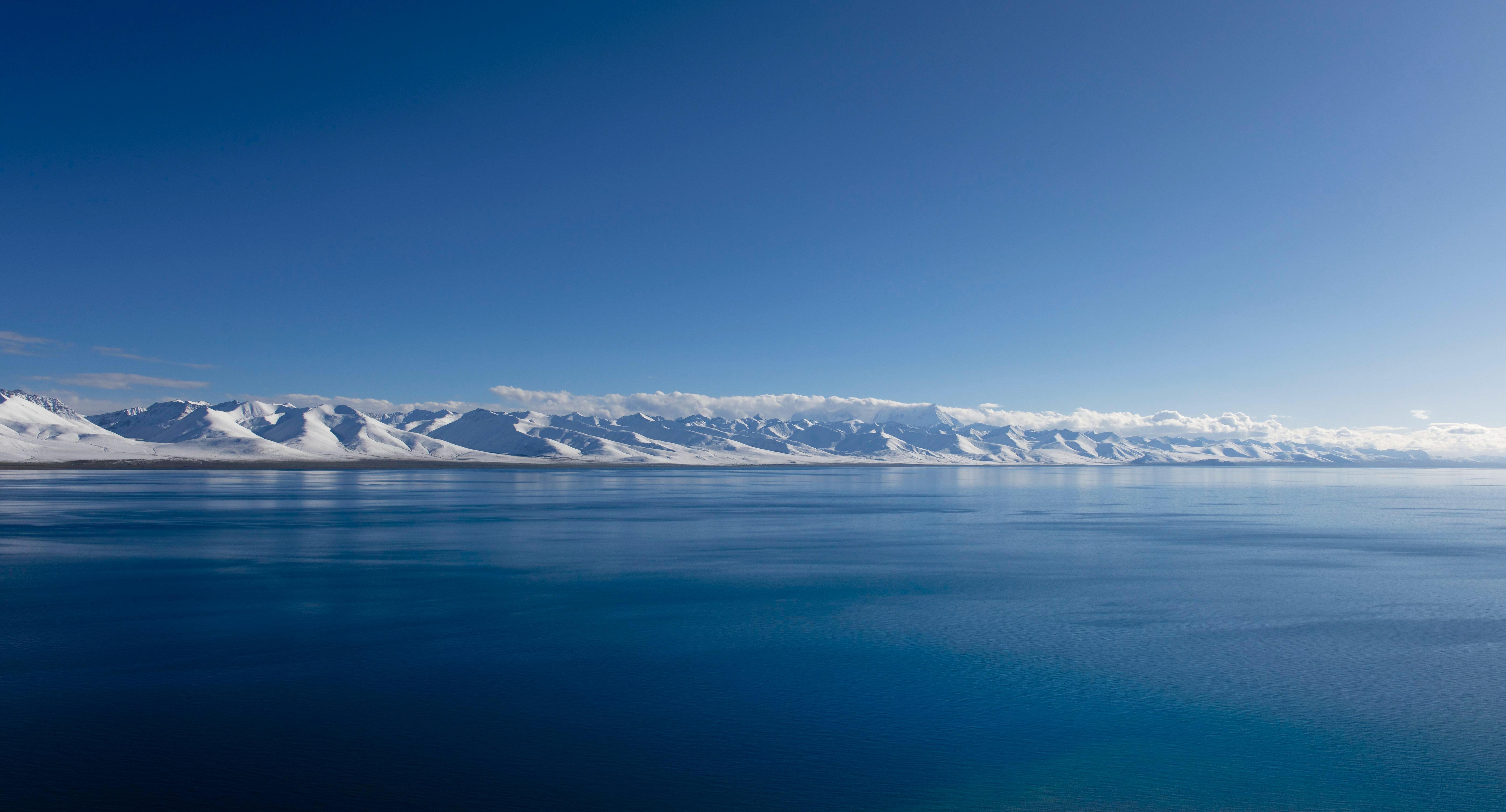 Mountain Lake, Winter Landscape, Snowy Peaks, Serenity 5K Desktop and Mobile Wallpaper Background with a maximum resolution of 5592x3017 px.